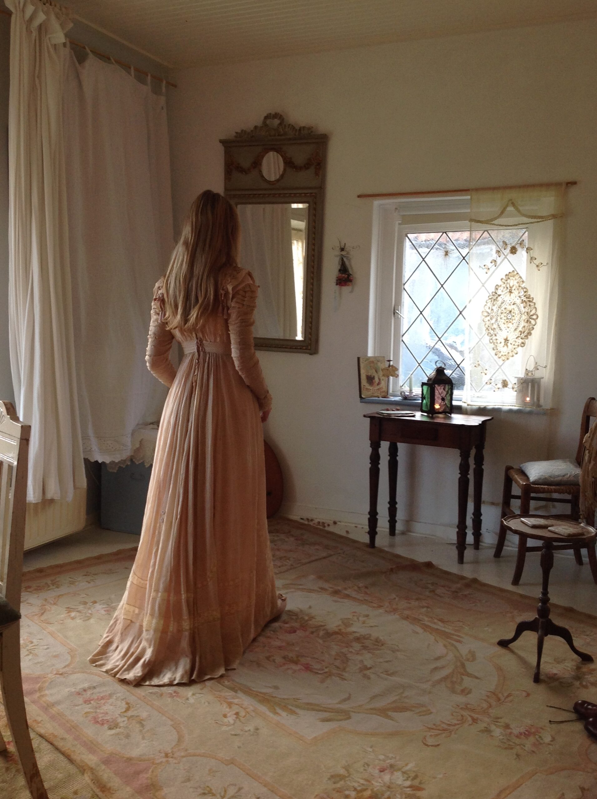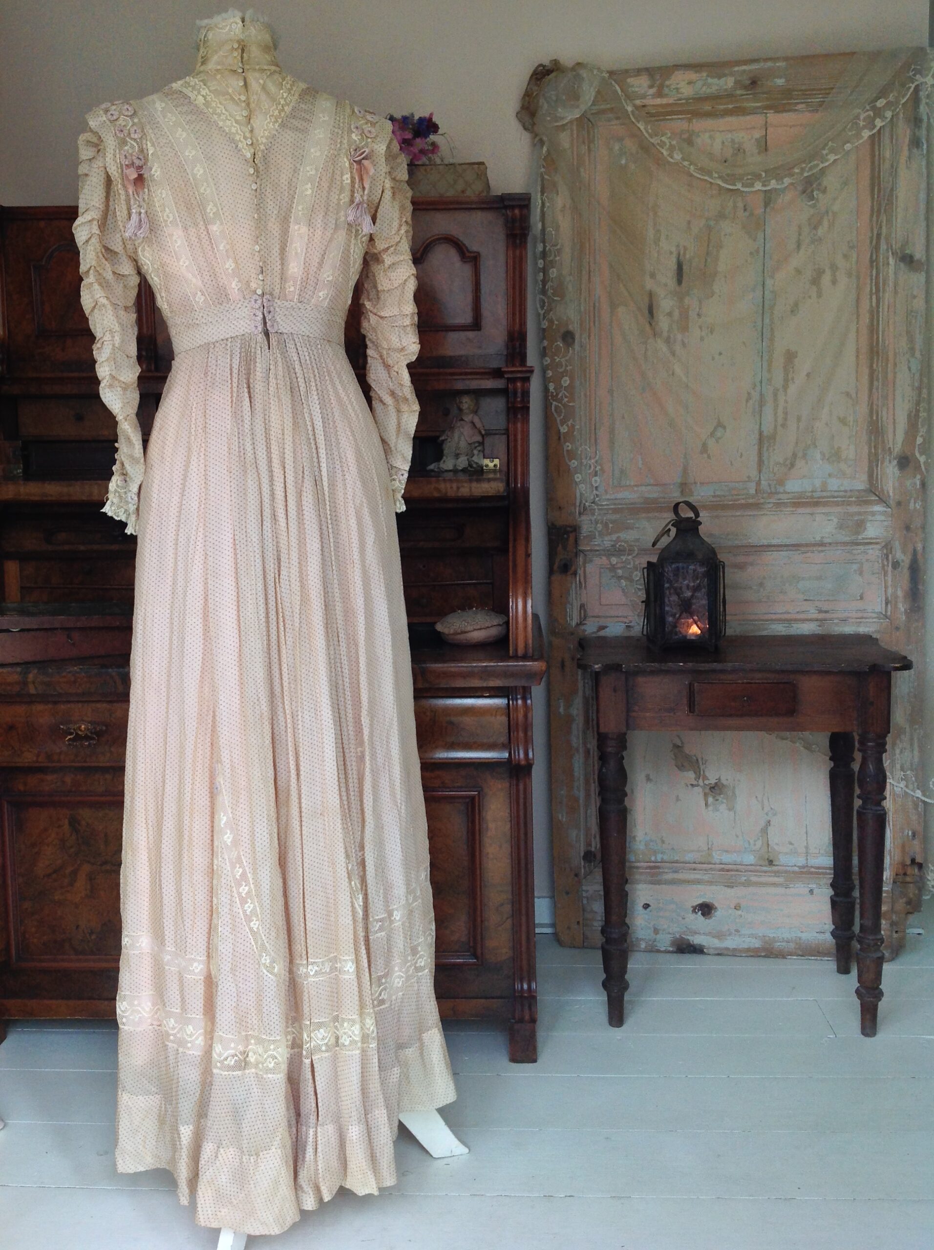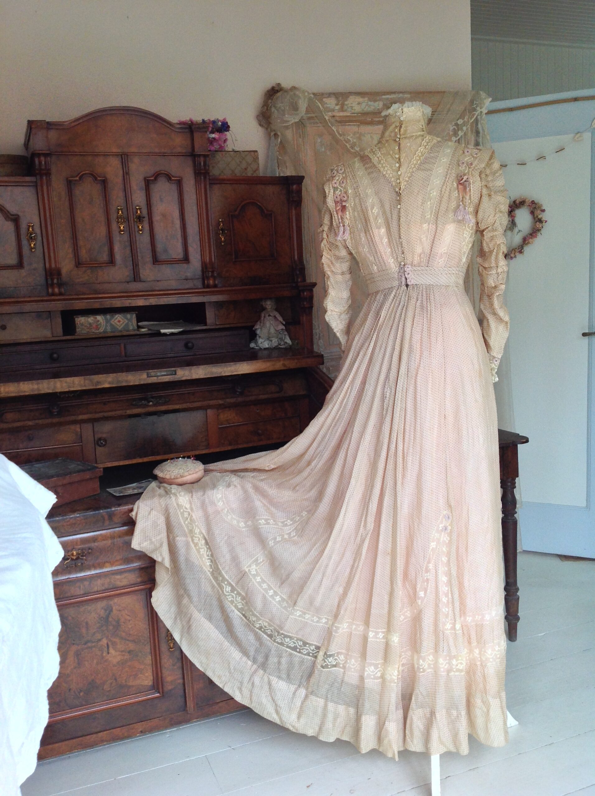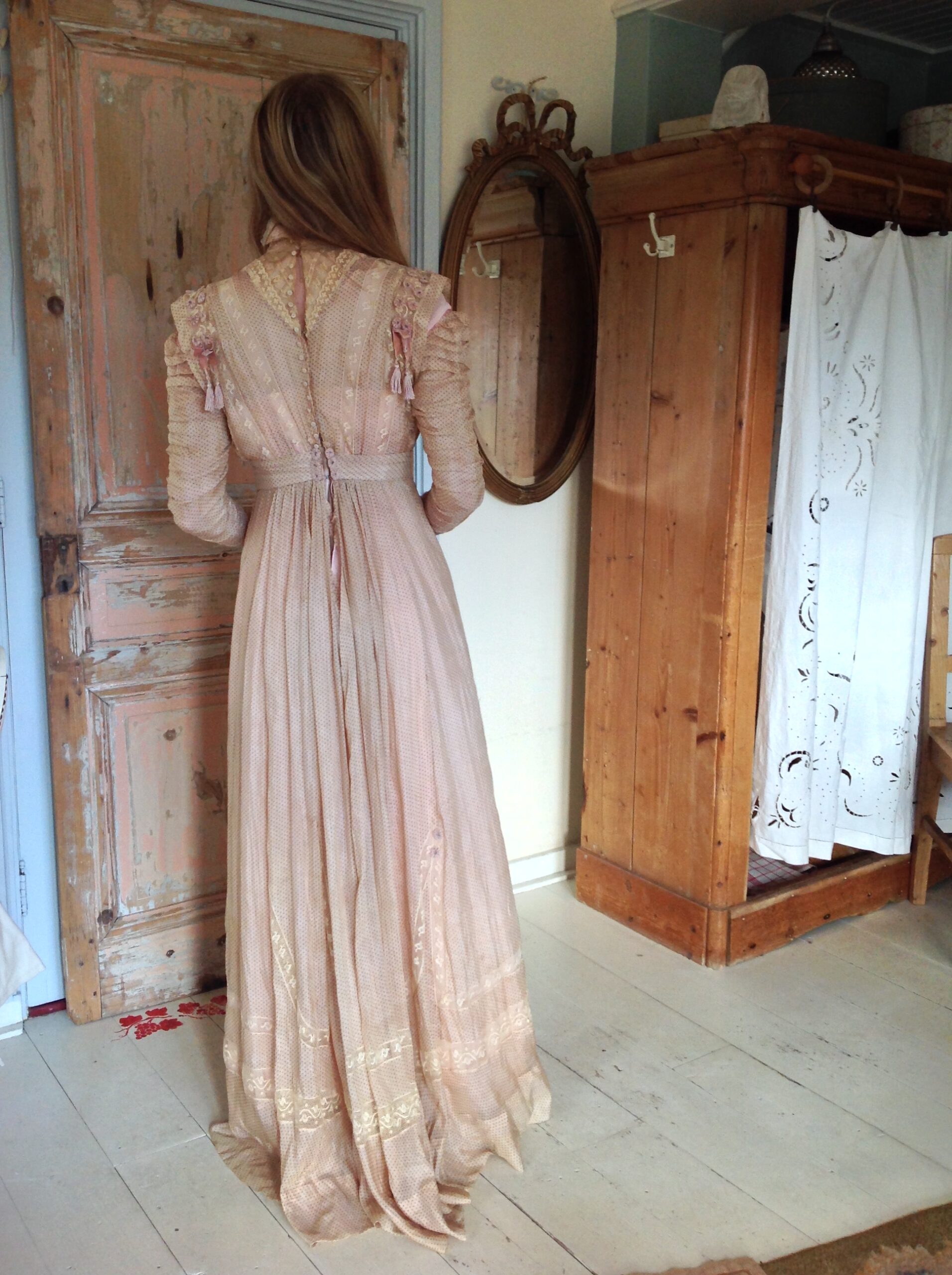 The pink underdress is made of rayon with a silk chiffon layer. This inner dress is not the original one. I made it in the dress because the original pink silk one was unfortunately badly shredded..