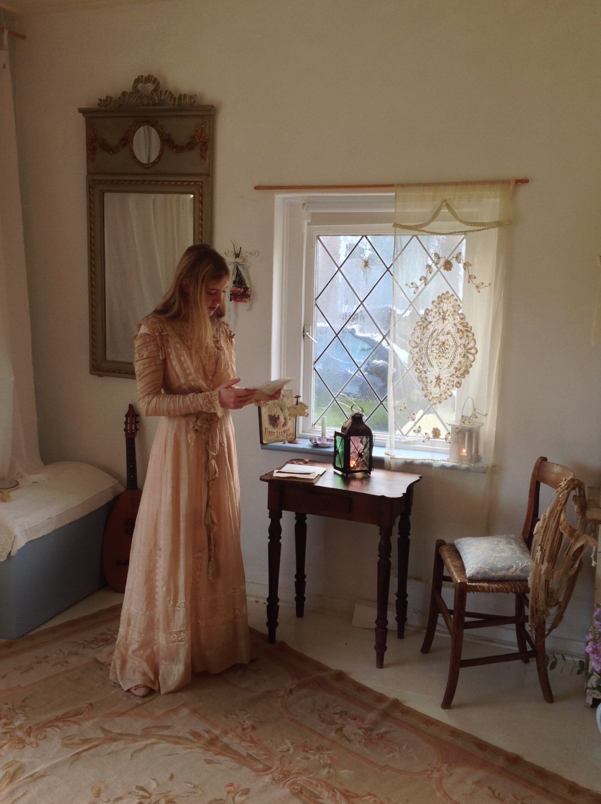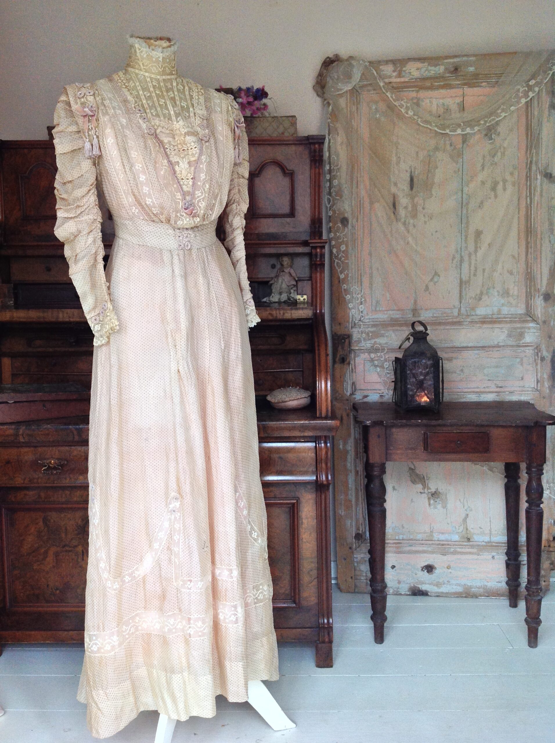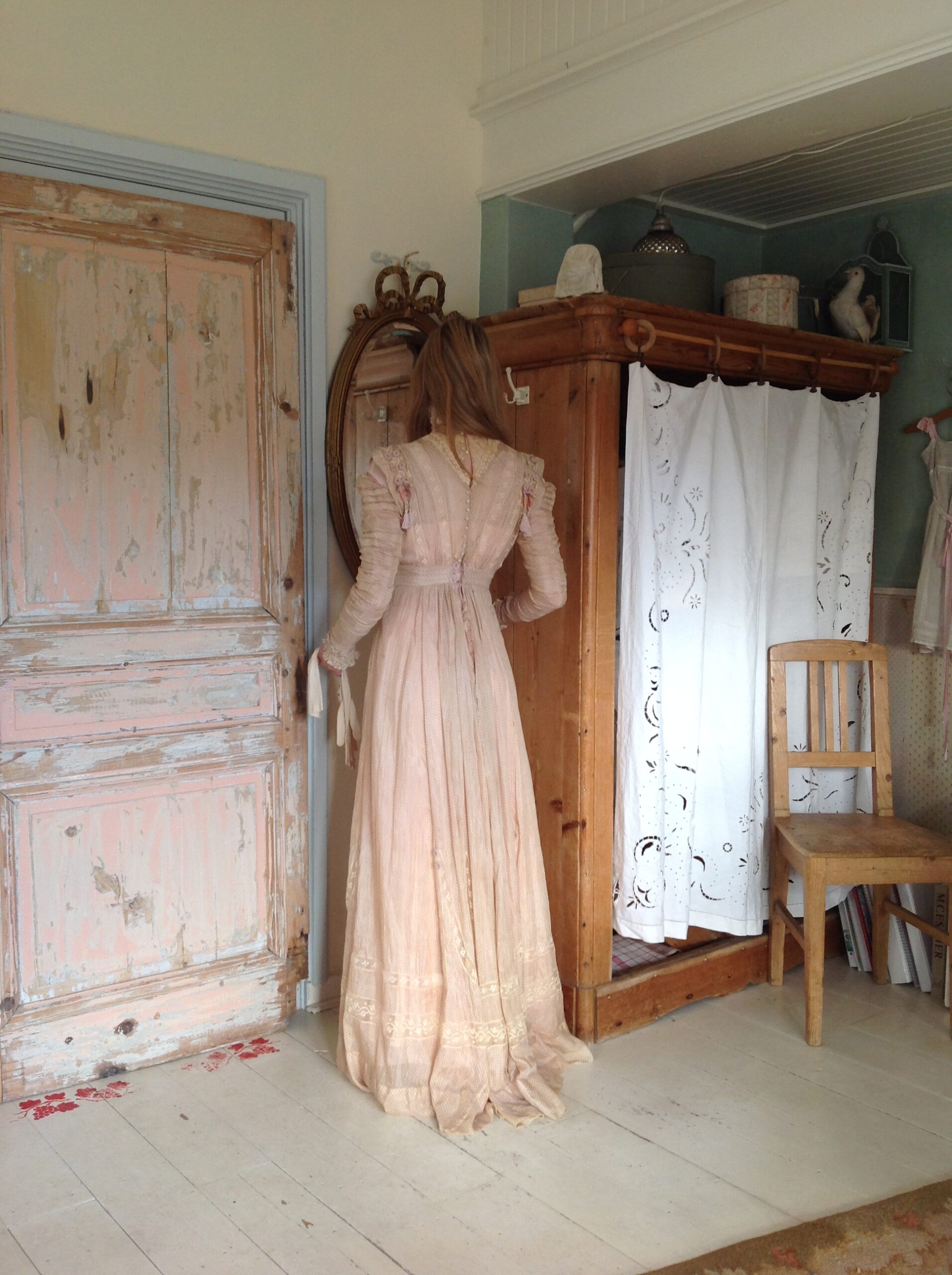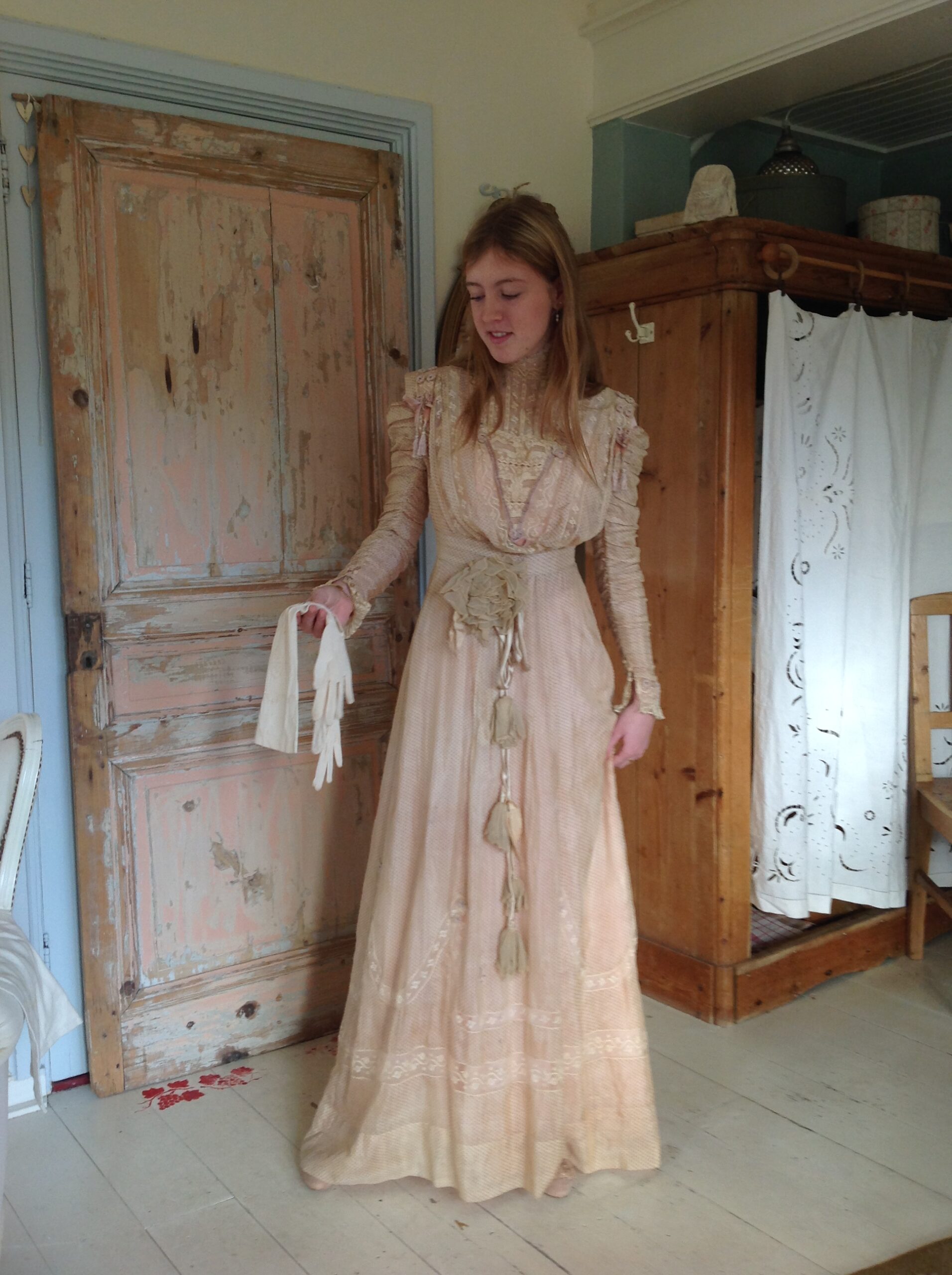 The pink underdress is made of rayon with a silk chiffon layer. This inner dress is not the original one. I made it in the dress because the original pink silk one was unfortunately badly shredded..