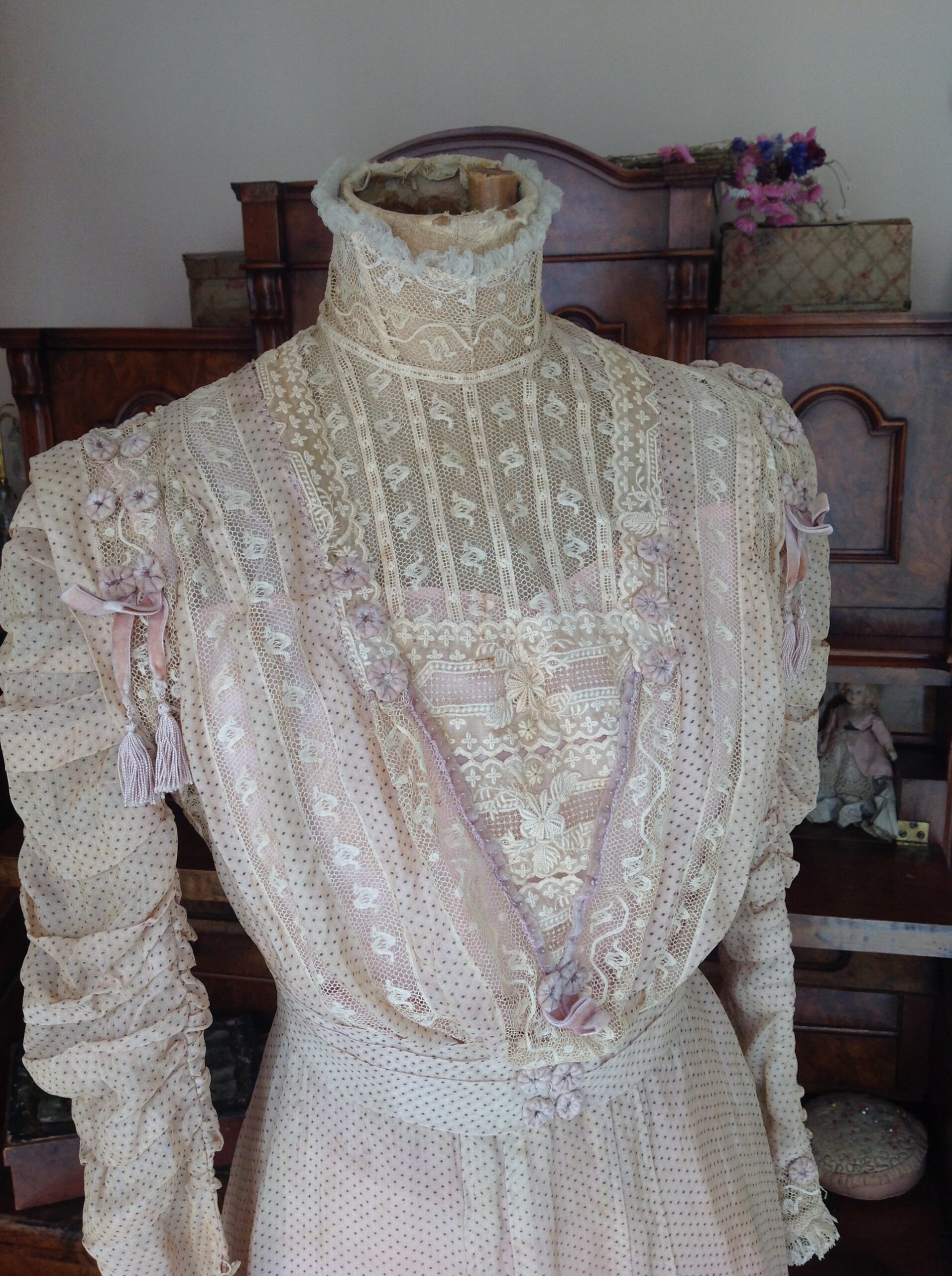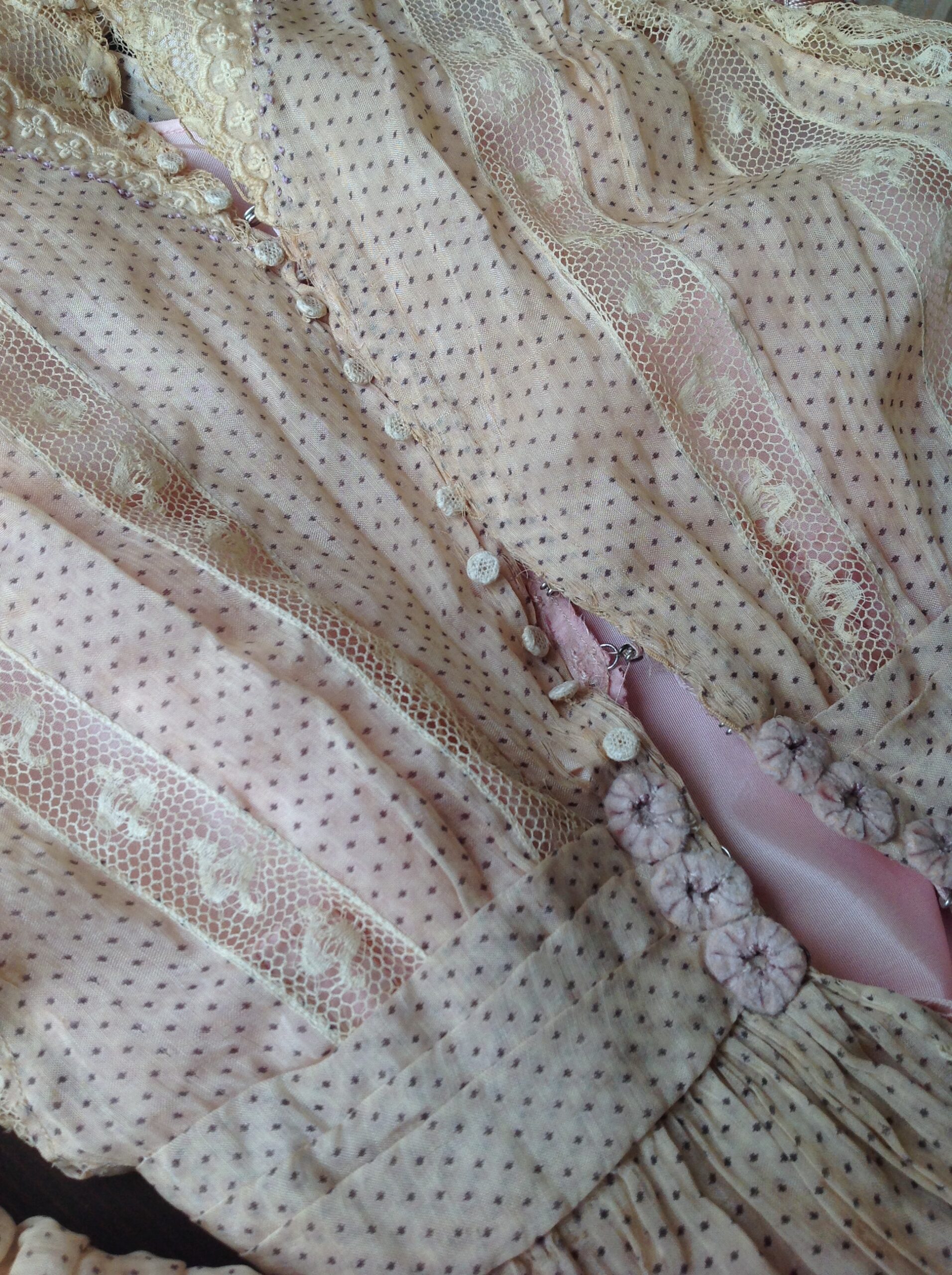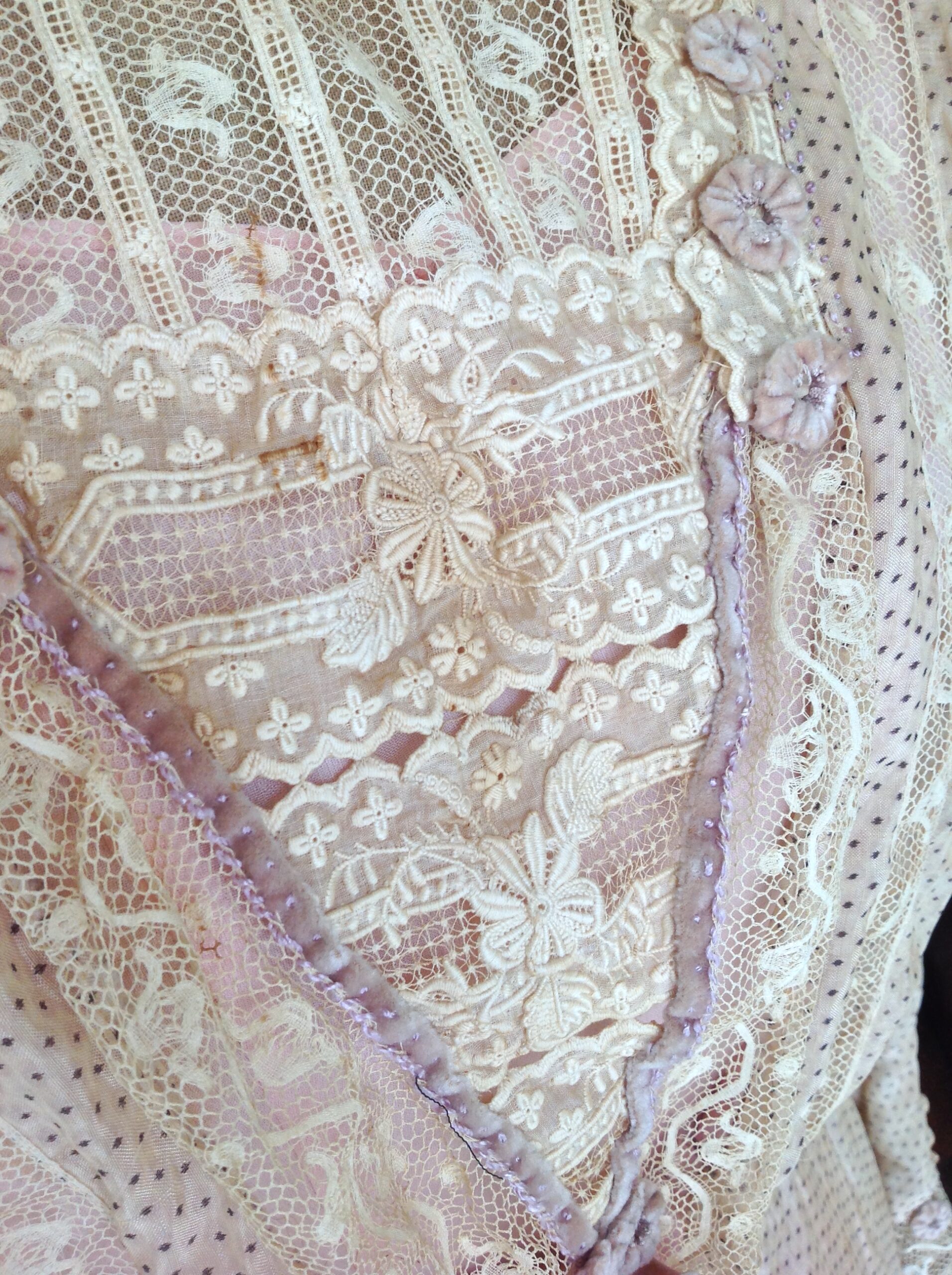 This dress is made of dotted fabric (silk/wool blend), embellished with lace inserts, purple velvet flowers and ribbons, and beautiful embroidery work. This fabric is very delicate, making it probably only suited for display. The dots have a purple color too. The dress is probably from the 1860s.