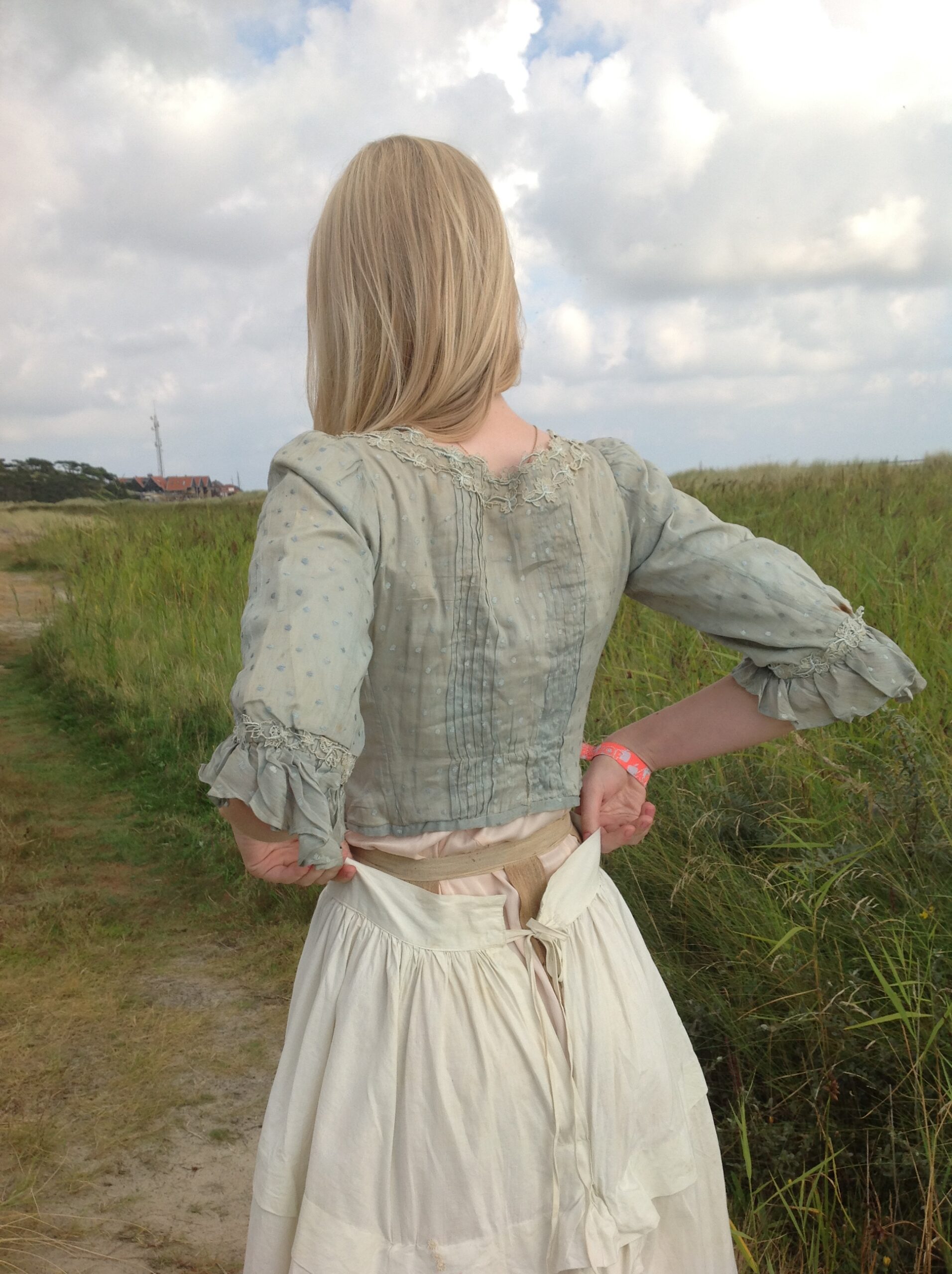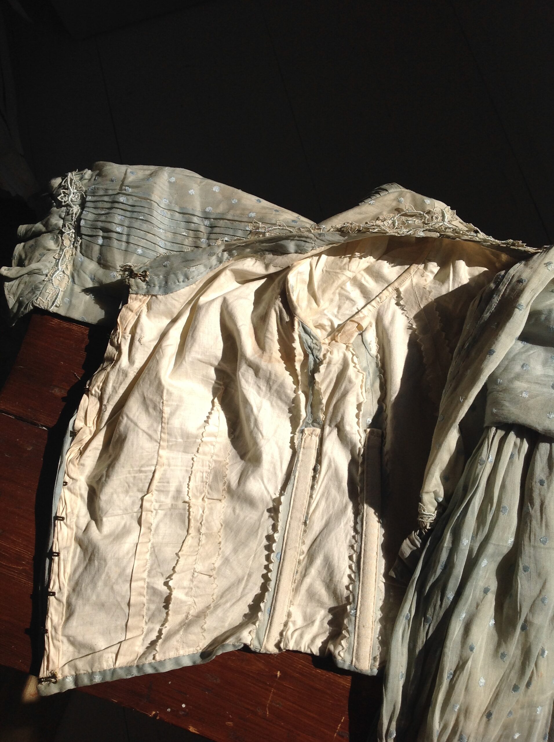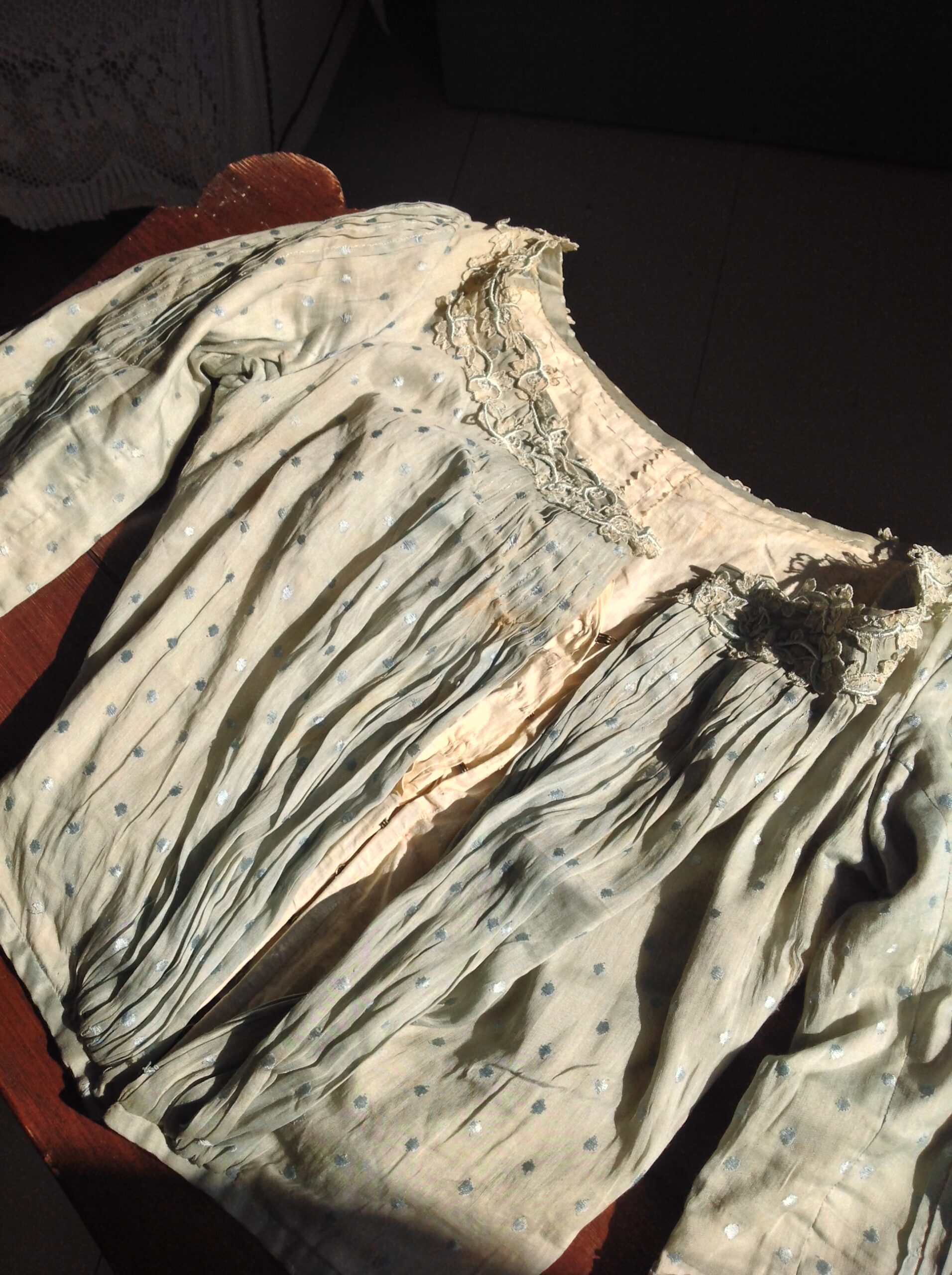 This beautiful antique blouse is made of silk with a cotton lining. The floral lace is handmade with silk thread too. The bodice has an hook and eye closure in the lining and there are bones in it. The outer silk layer has woven dots, pin tuck work and lovely floral lace.