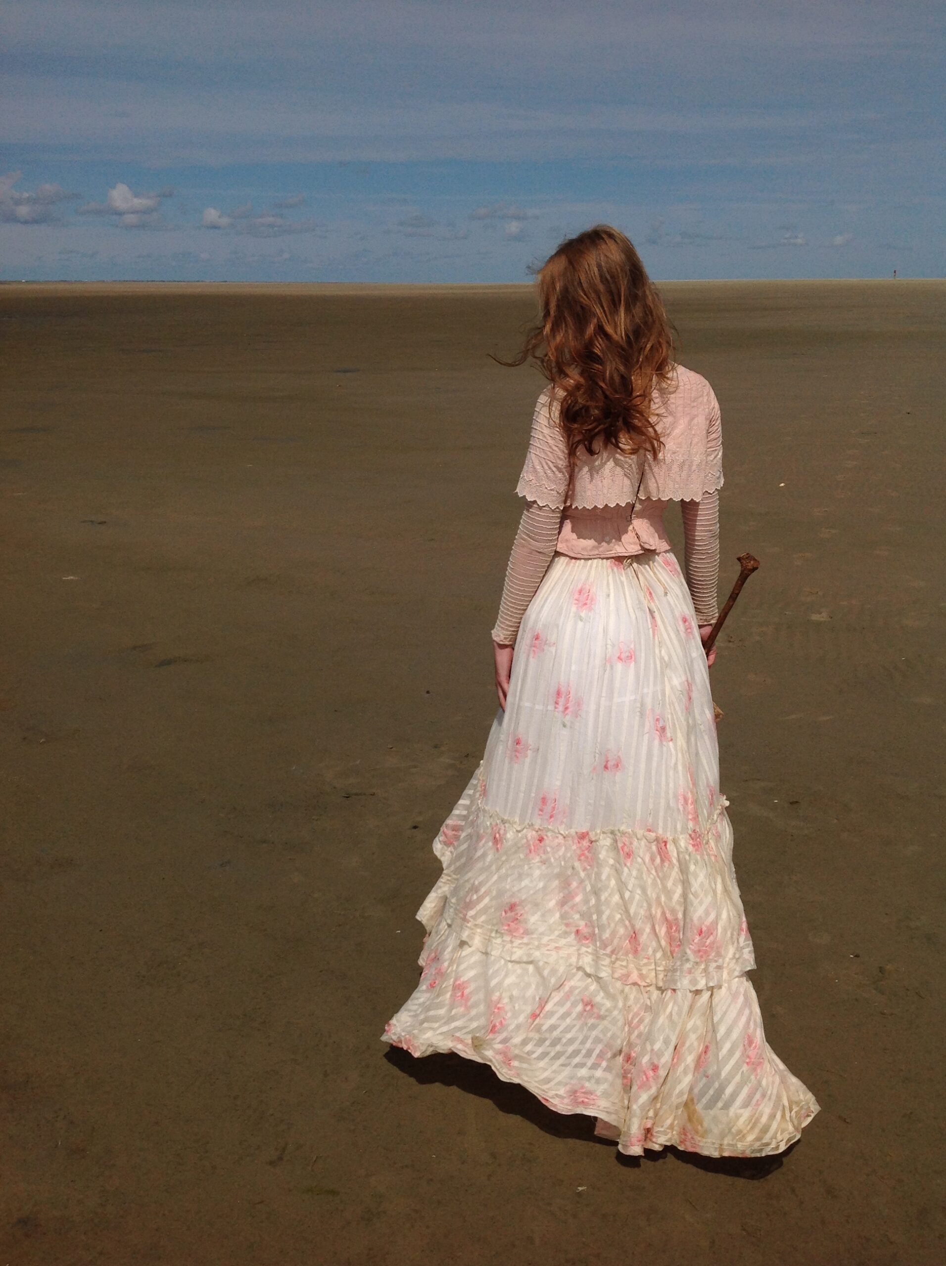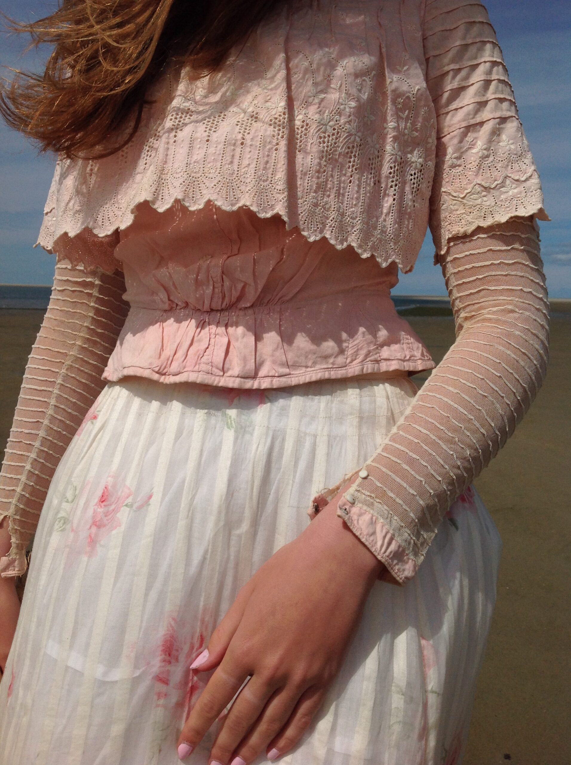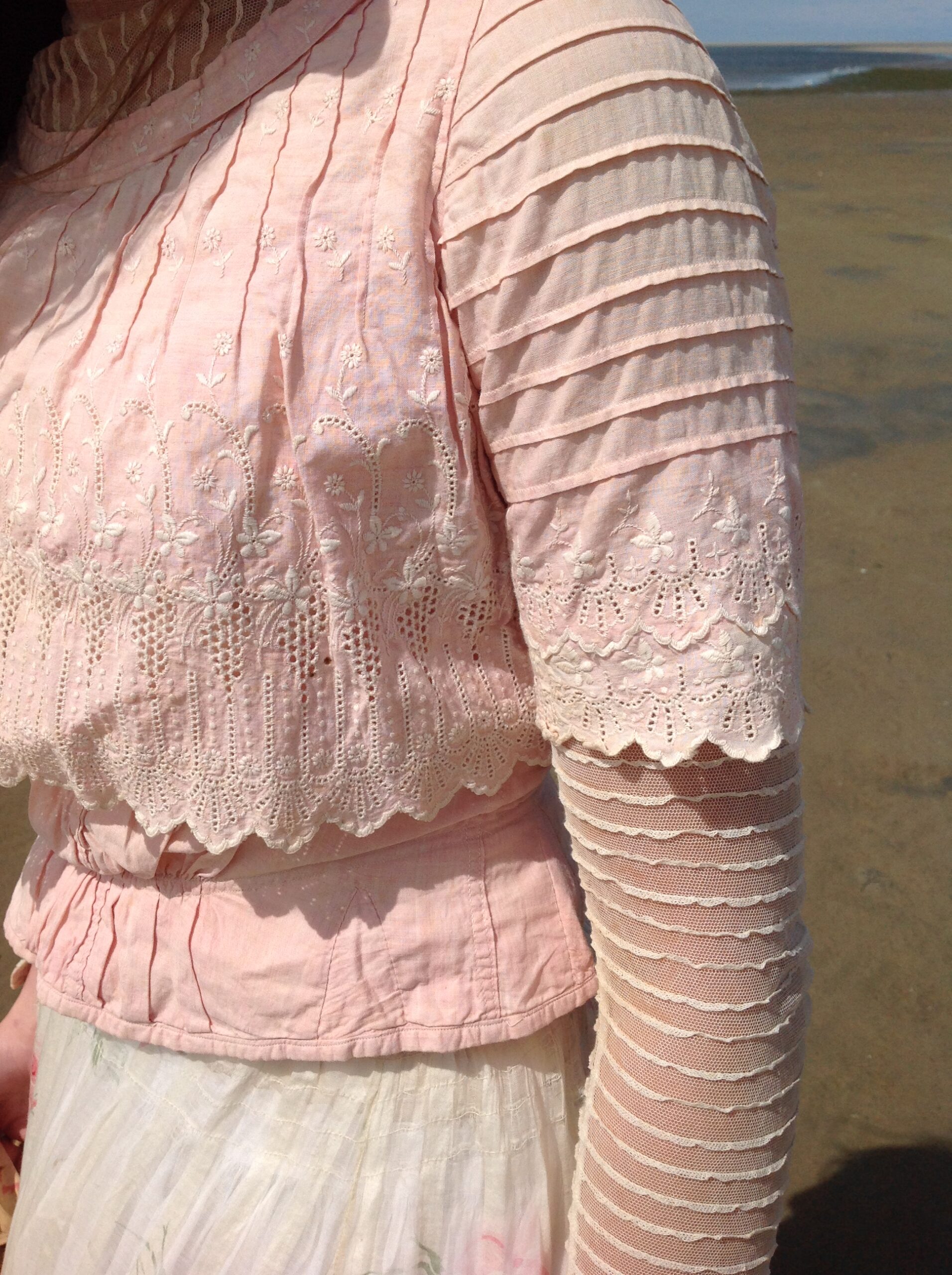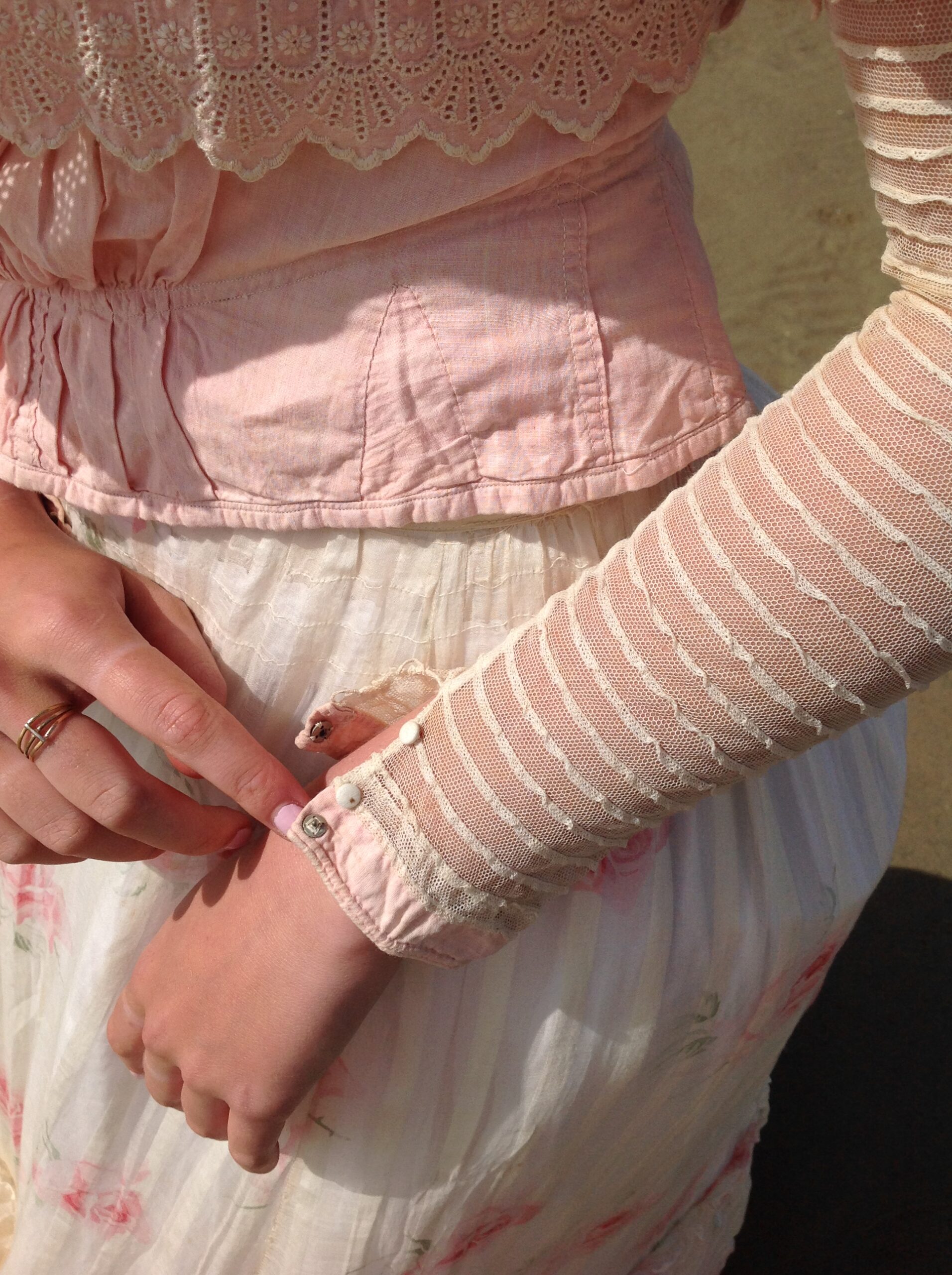 Strong cotton bodice with tulle sleeves and huge bertha collar. Full of floral embroidery work (broderie). The (very small) tulle sleeves have a lot of pin tucks and, as you can see, beautiful most tiny white fabric buttons. The high neck has bones behind it. The bodice is lined with light pink cotton.