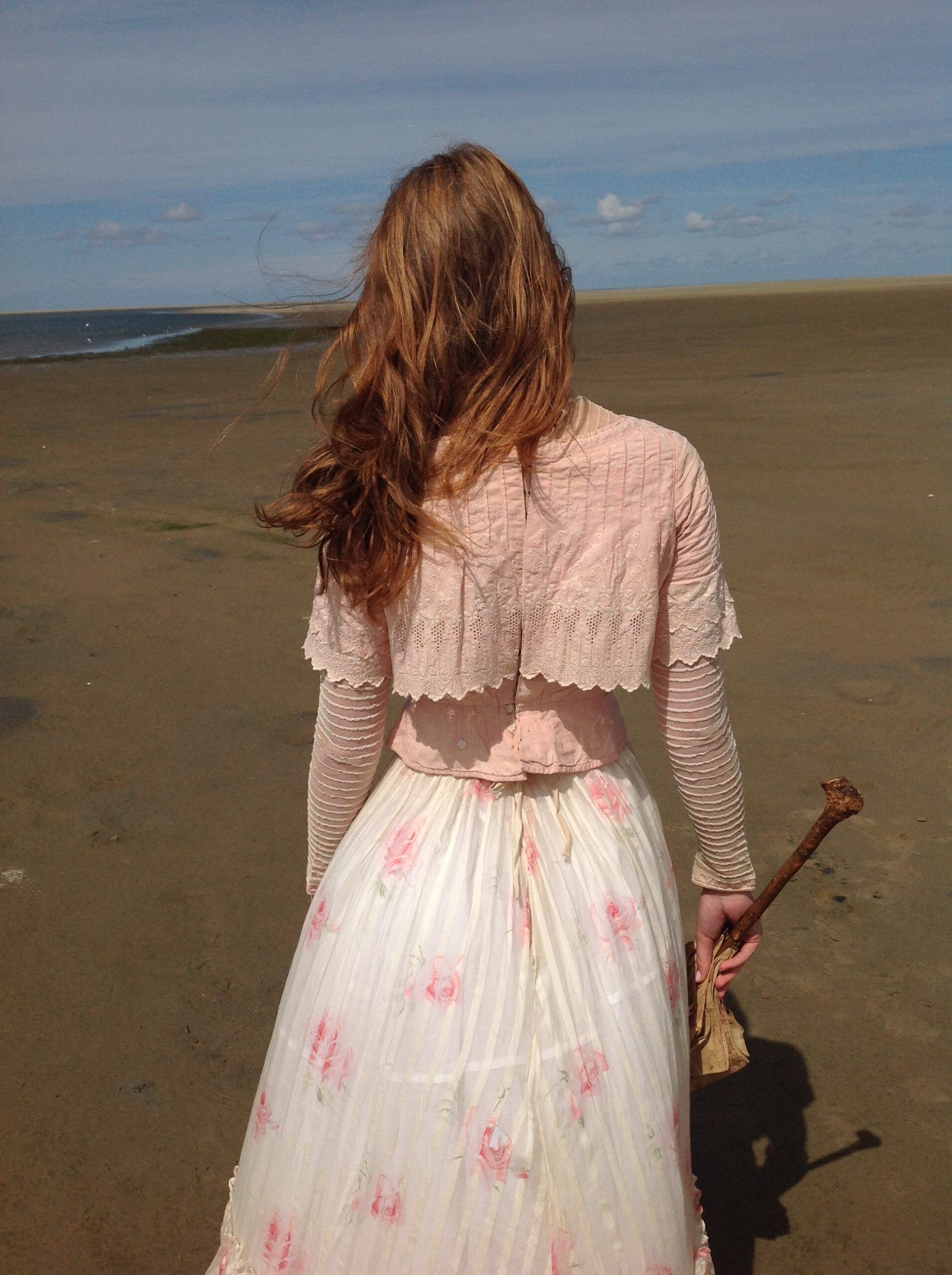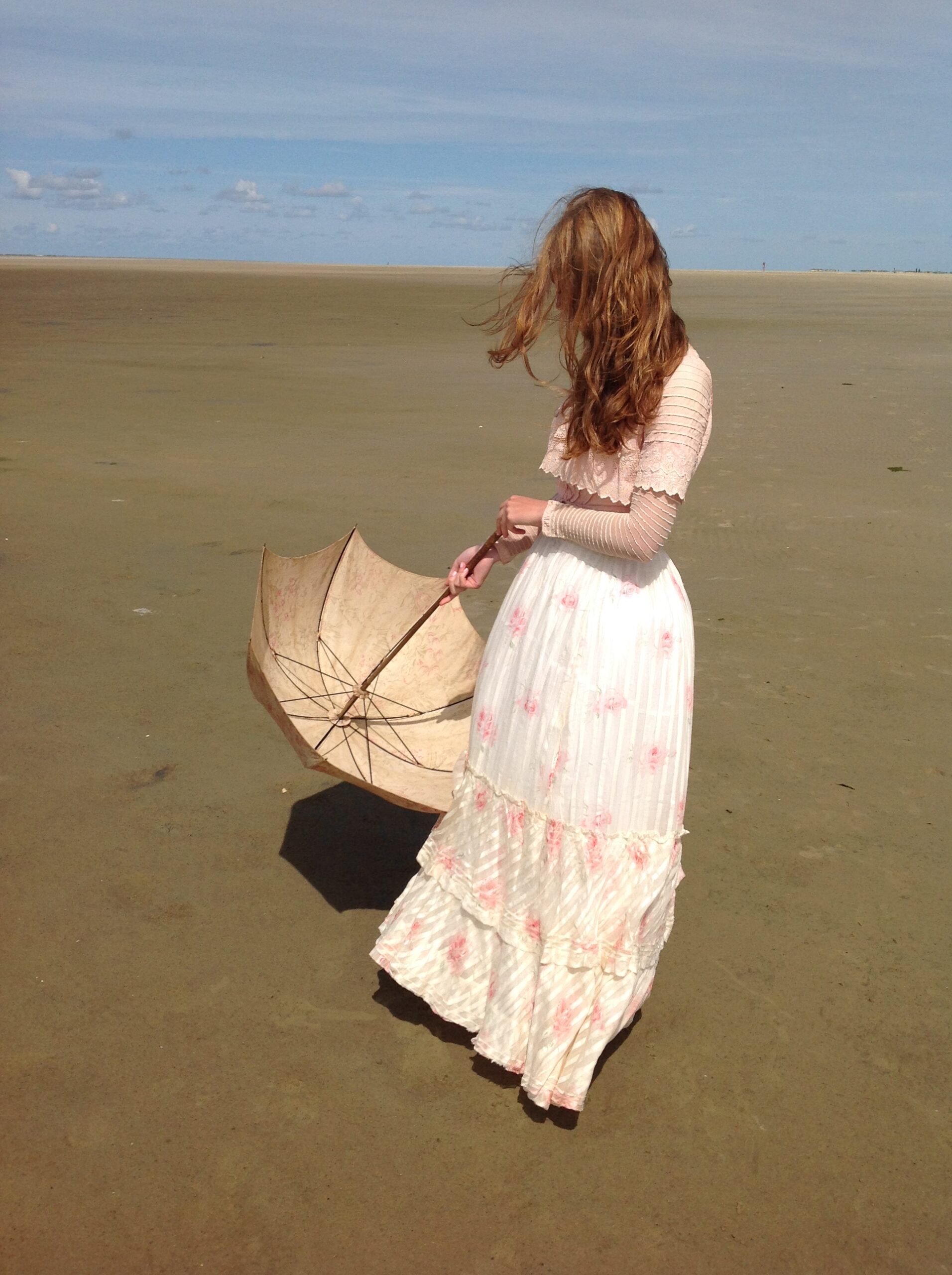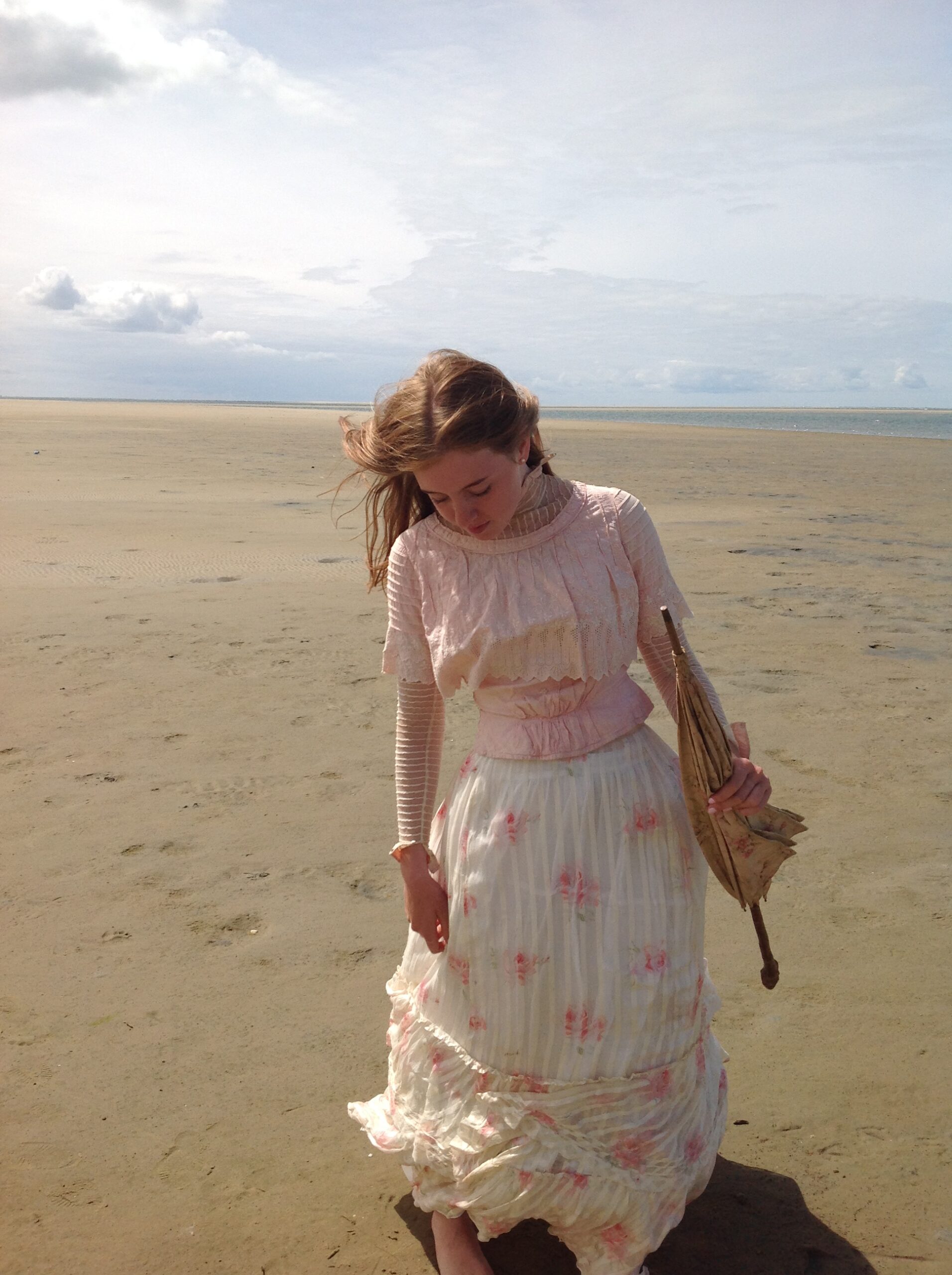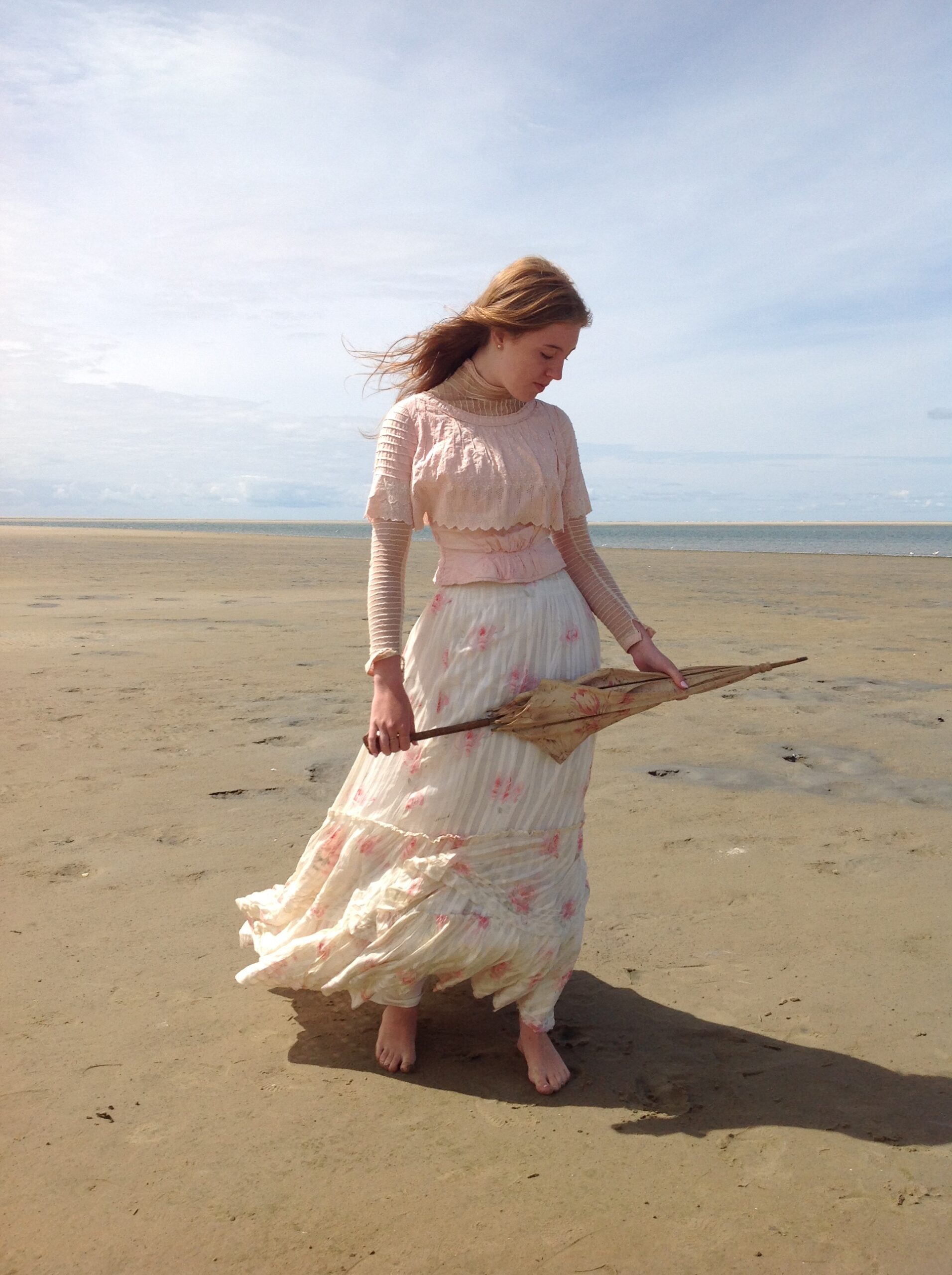 Strong cotton bodice with tulle sleeves and huge bertha collar. Full of floral embroidery work (broderie). The (very small) tulle sleeves have a lot of pin tucks and, as you can see, beautiful most tiny white fabric buttons. The high neck has bones behind it. The bodice is lined with light pink cotton.