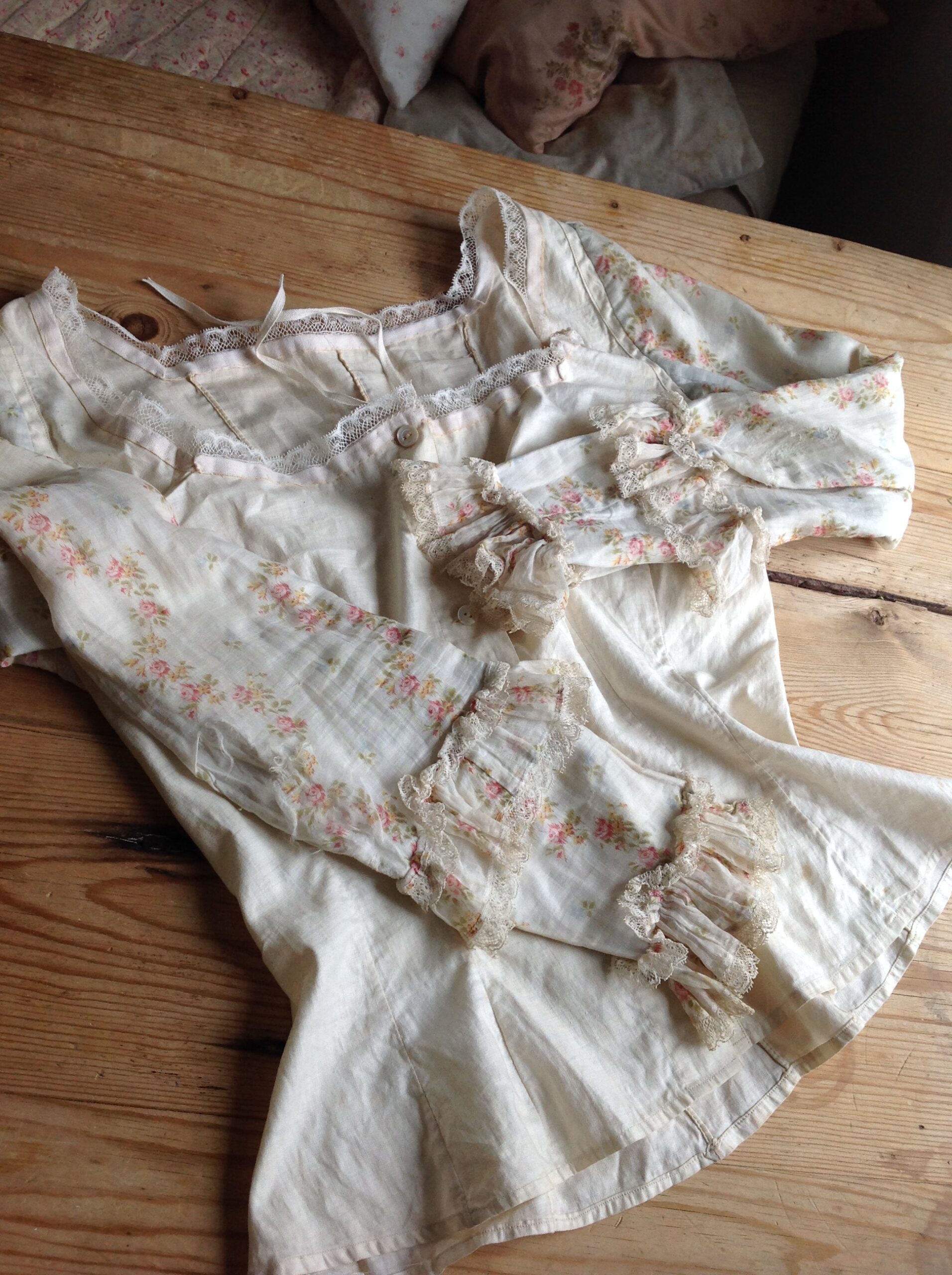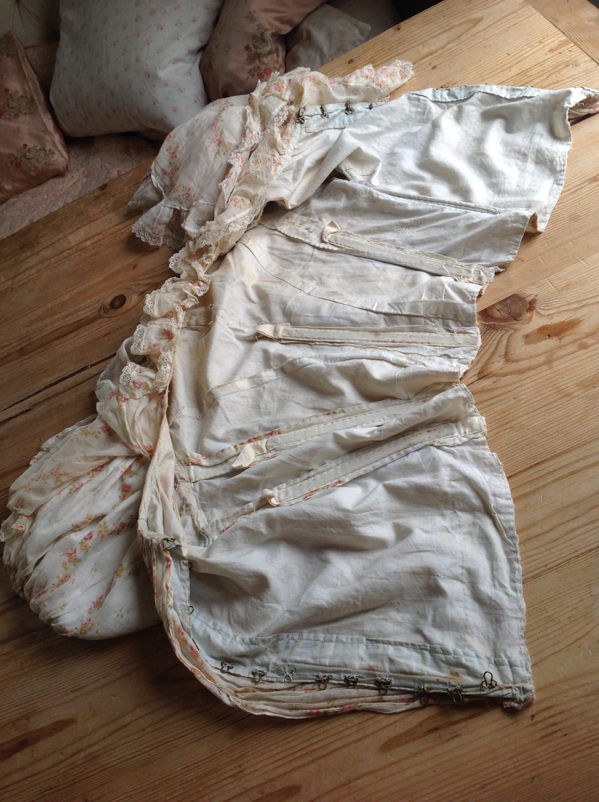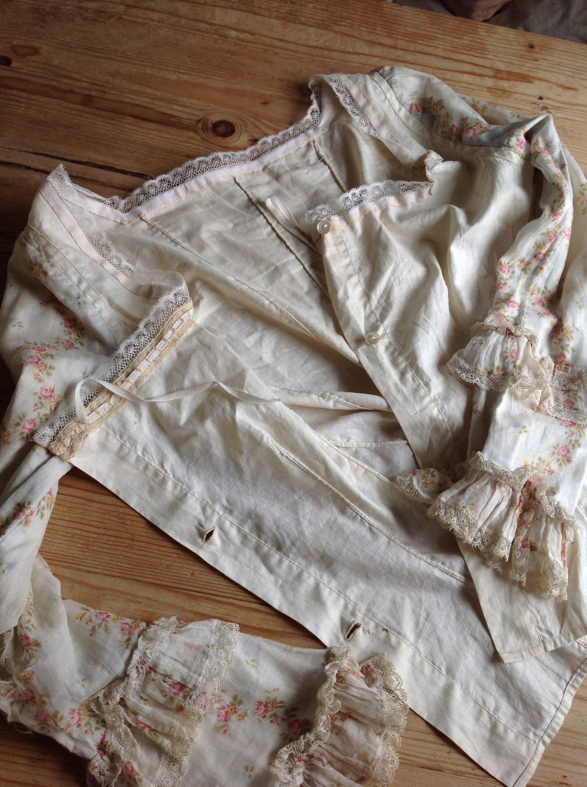 This blouse is made of cream white cotton with long sleeves. These sleeves are covered with the same floral muslin fabric as both skirt and bodice. The fabric in this area has some damage. There is a bit underarm discoloration. The blouse has a button front closure and the square neckline has a lovely antique ribbon with a cotton tie behind so you can adapt its shape.