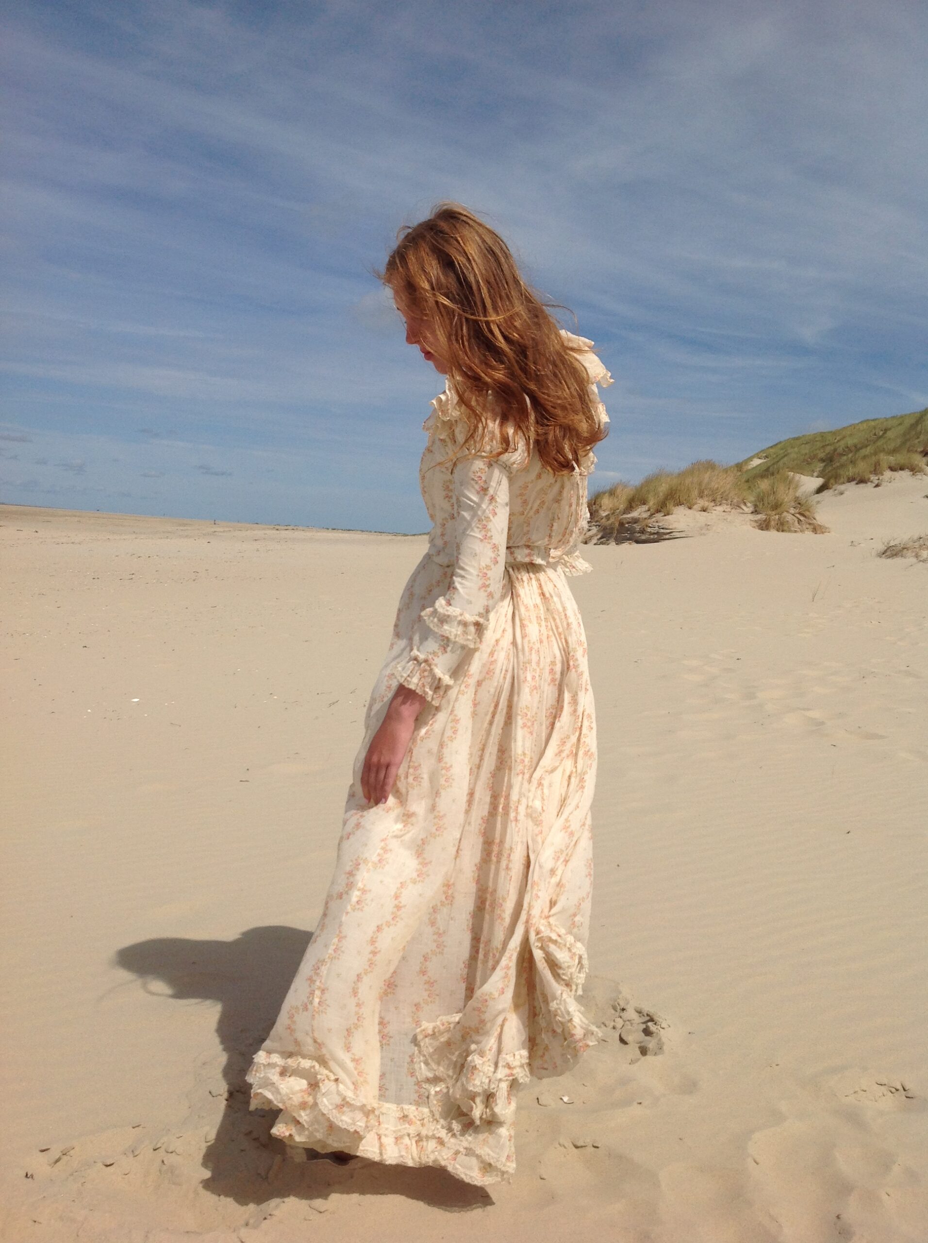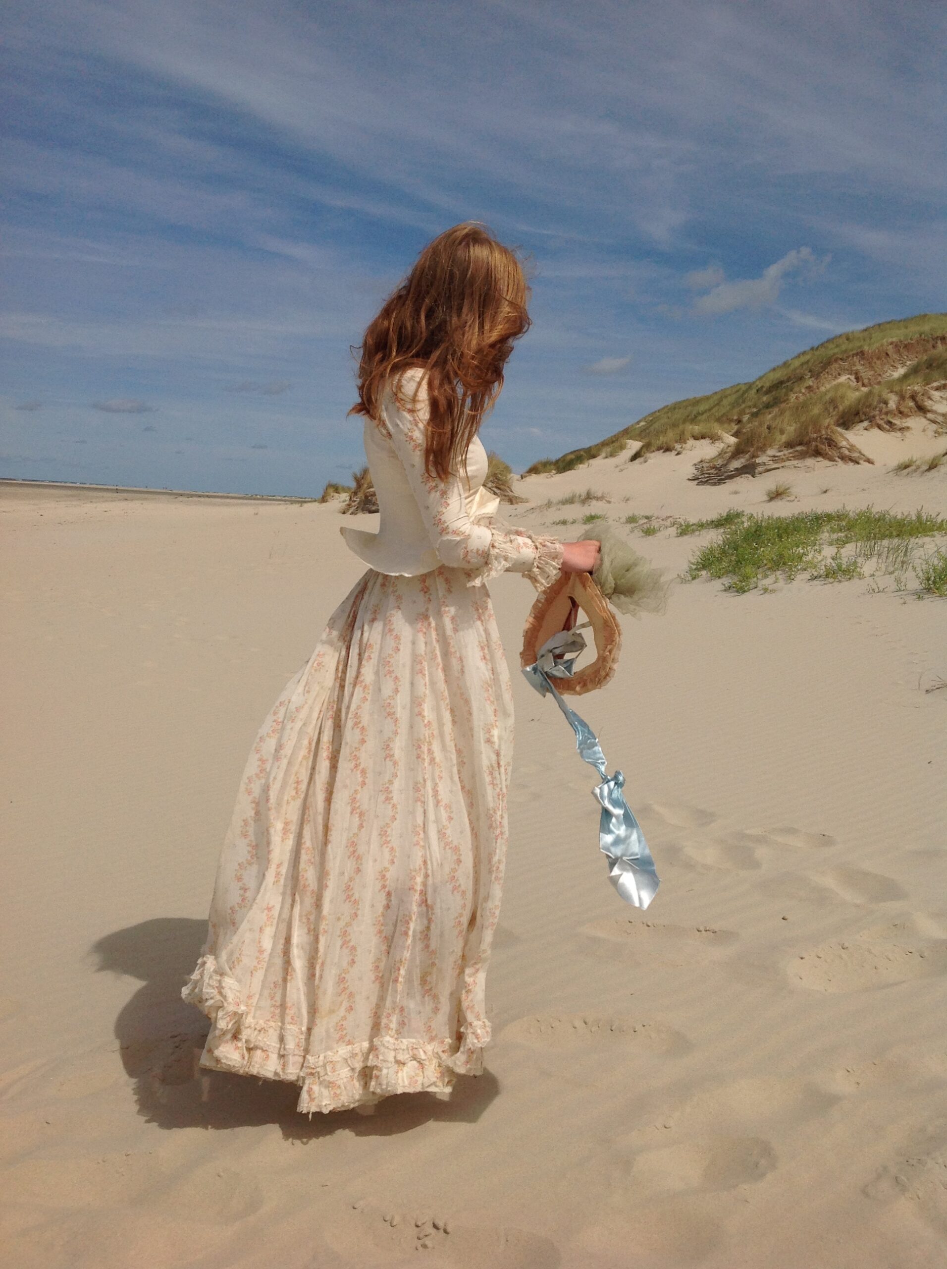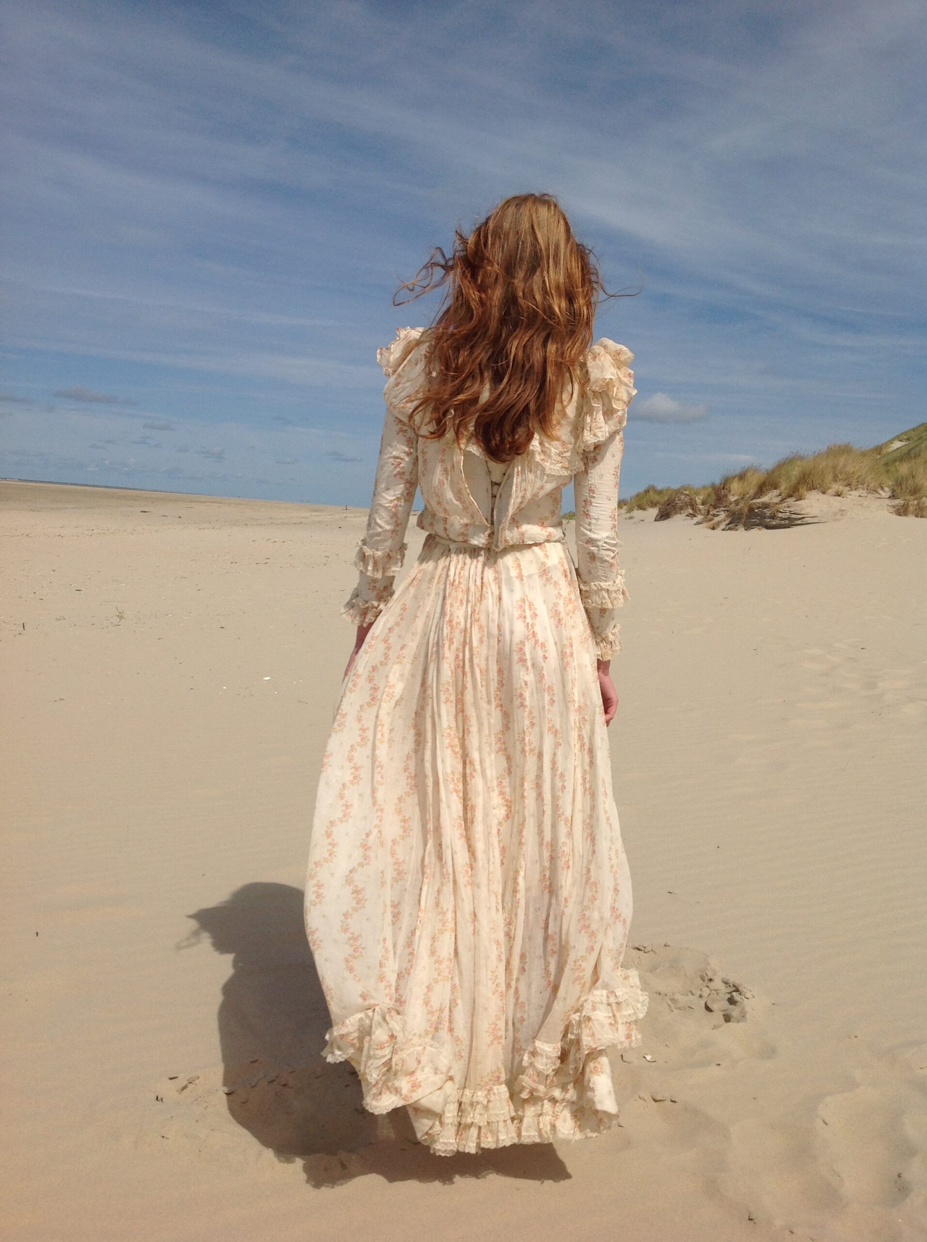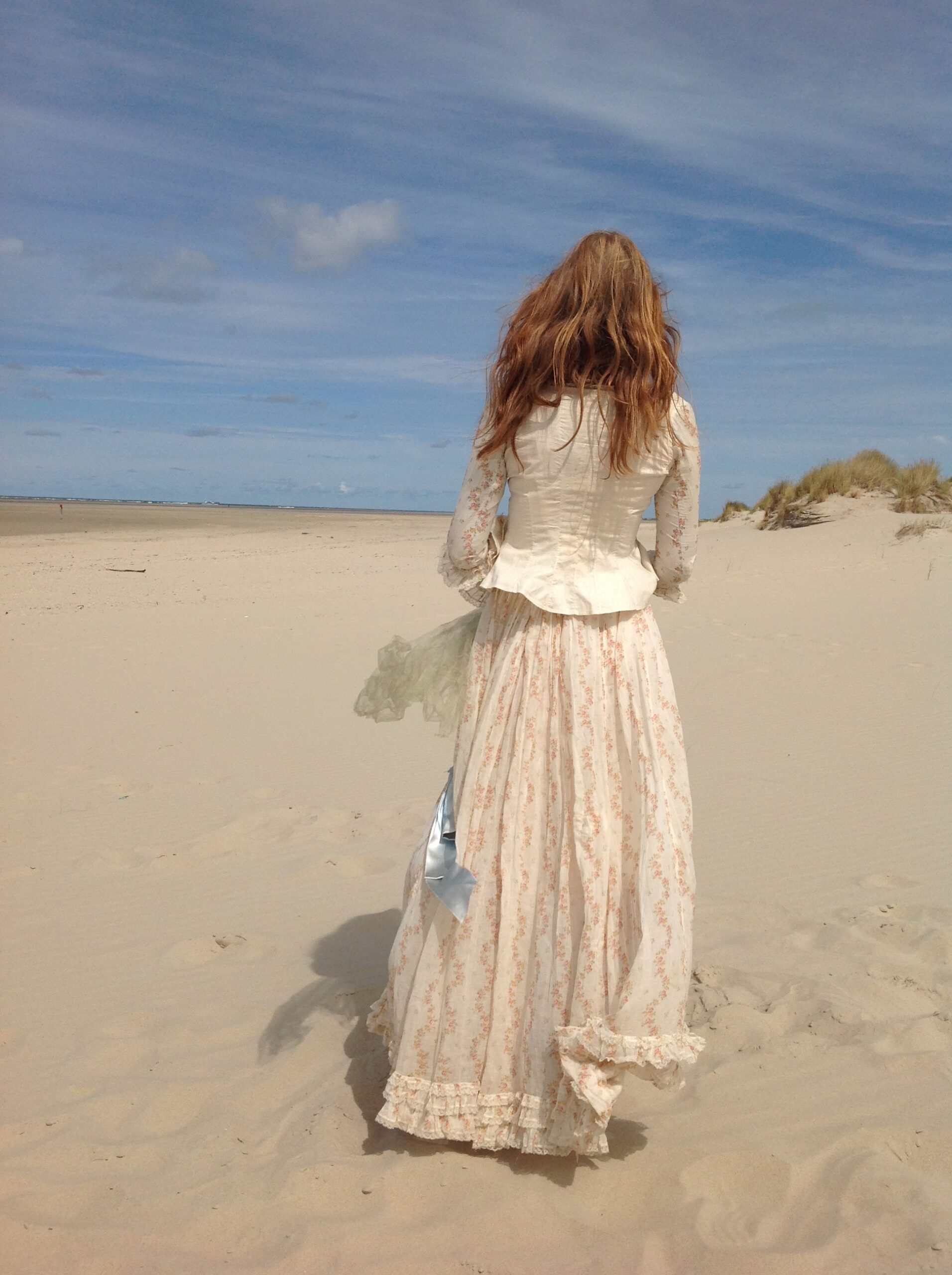 This blouse is made of cream white cotton with long sleeves. These sleeves are covered with the same floral muslin fabric as both skirt and bodice. The fabric in this area has some damage. There is a bit underarm discoloration. The blouse has a button front closure and the square neckline has a lovely antique ribbon with a cotton tie behind so you can adapt its shape.