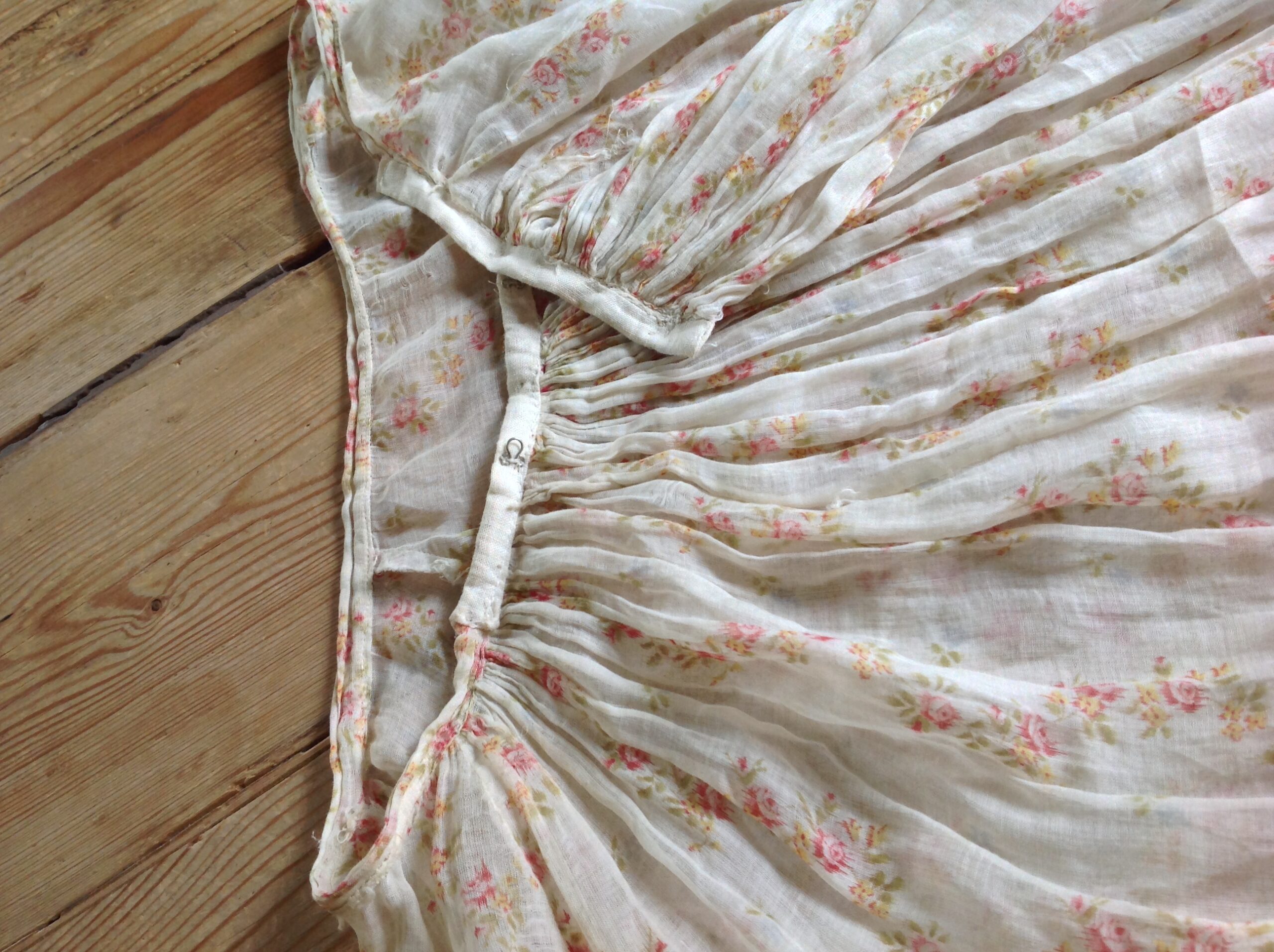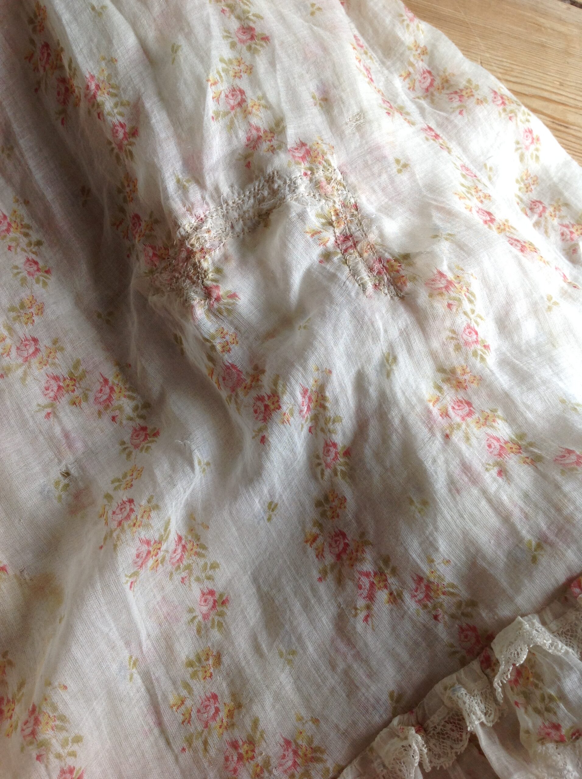 This is a floral muslin cotton skirt with ruffles and ruffled lace trims. This skirt had machine made repairs when I found it. This is not how I mend antique clothing. I only work with a most tiny needle and thread or silk to do some mending. The machine-made repairs, however, make this dress wearable. The skirt is unlined. The floral print has red, green and yellow colors. You can also see a bit of blue. but that’s already mostly faded.