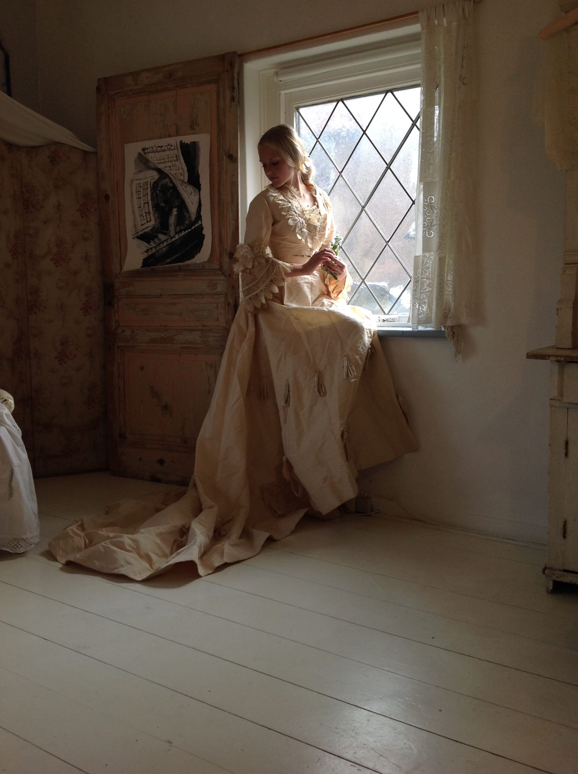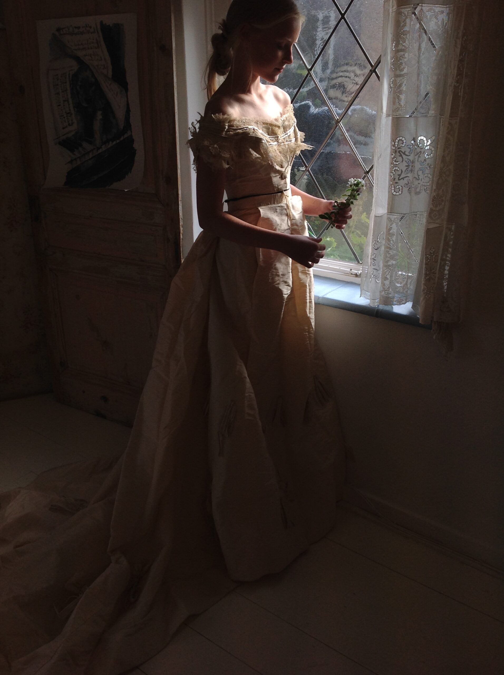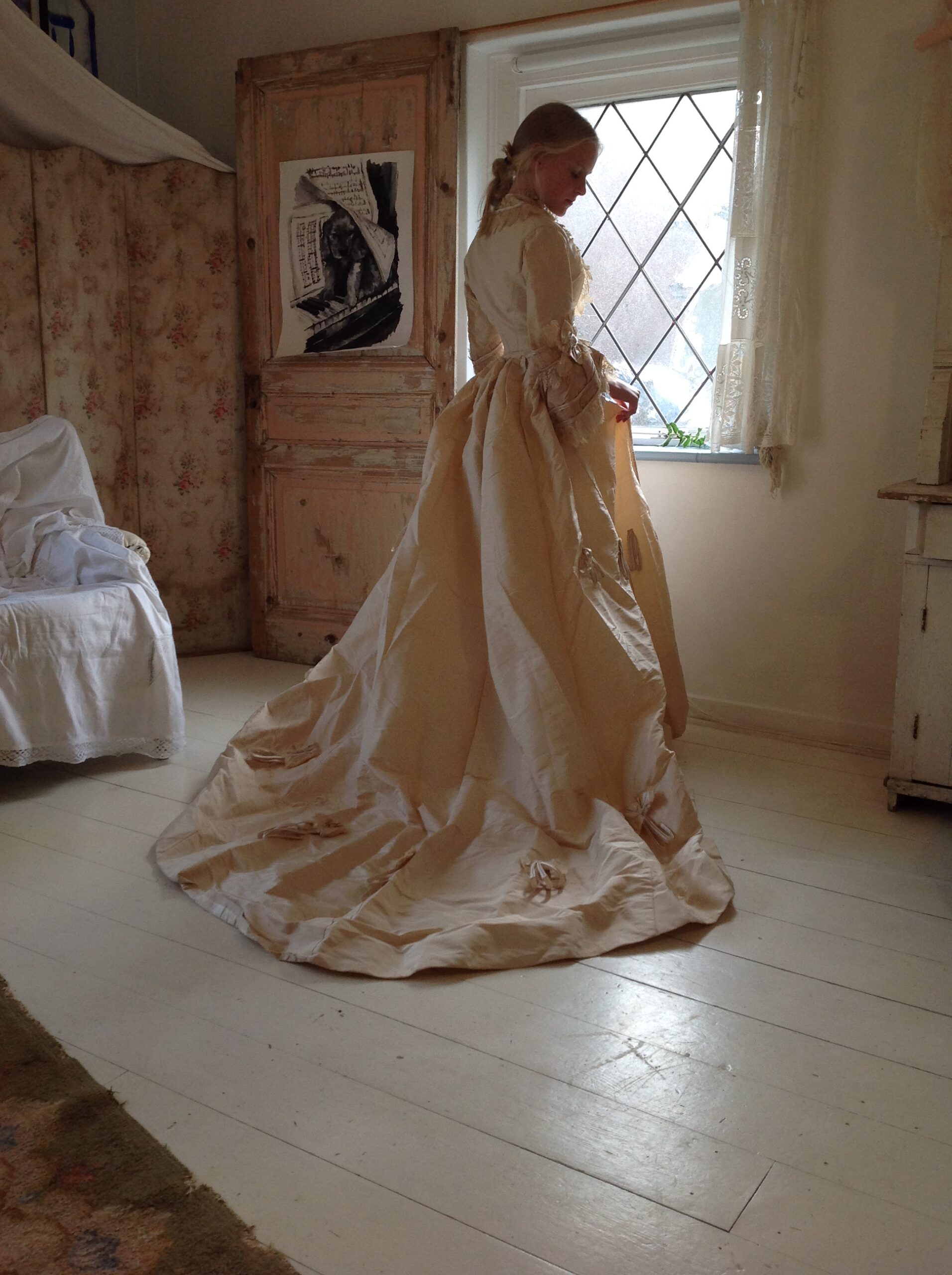 The skirt has a hook and eye closure and a huge train. Only the train has a lining. The lining there is made of linen canvas and silk, and this makes the skirt heavy at the bottom. The skirt is embellished with loops. The silk fabric is crispy. It makes a majestic sound when you walk in it. And it is in amazing good condition too! No marks, no tears, no discolorations, but sometimes there is a tiny little pin hole when you look close.