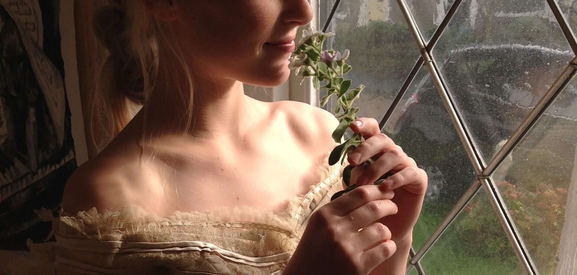 The bodice, off shouldered, has a front closure with 4 silk covered buttons. In the front are 4 baleens. The bodice is lined with a beautiful silk layer. As new… The neckline is embellished with silk gold colored lace with a leave and flower pattern.