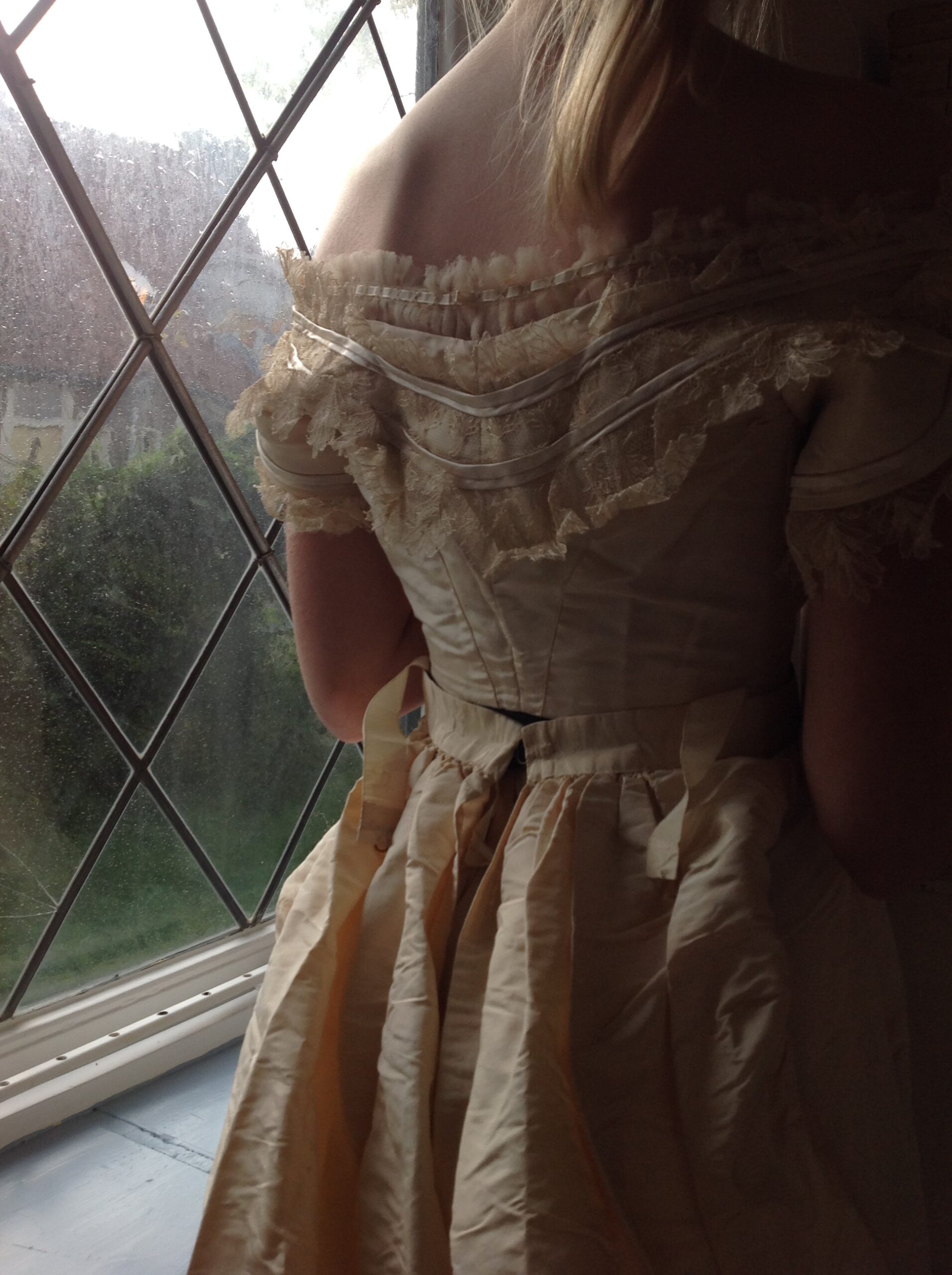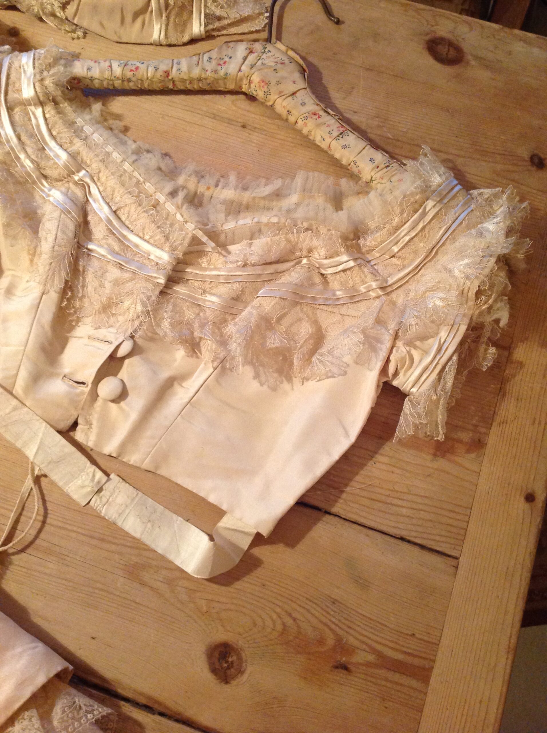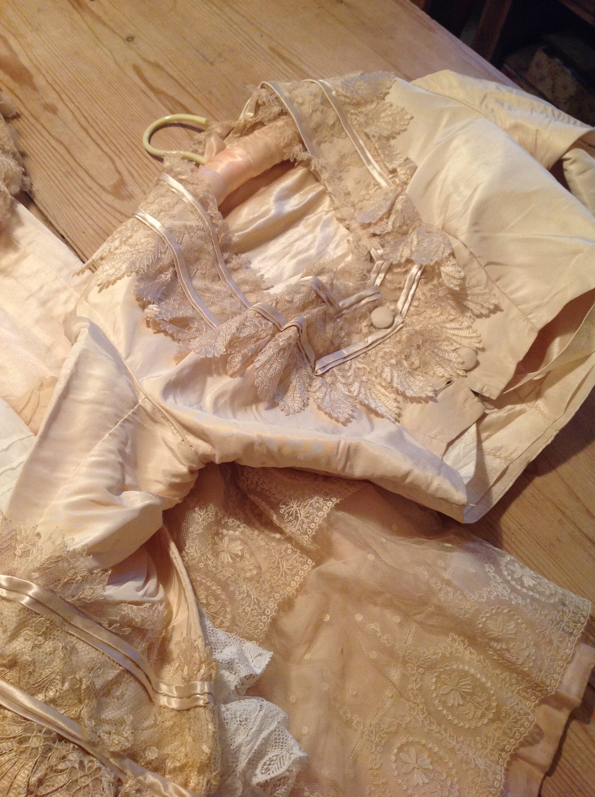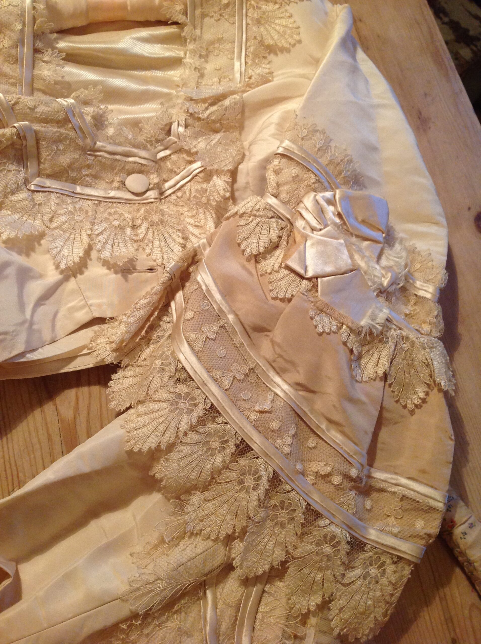 The jacket has 3/4 sleeves and is fun of the same beautiful silk lace with the leave and flower pattern. The sleeves have a silk bow, and there is even a inner sleeves in it with the same silk lace! The jacket has the same silk covered buttons and the same silk lining the bodice has. The jacket has no baleens. There are no underarm discolorations, one little tear in the arm pit , (only 1 little pin hole,) and no marks.