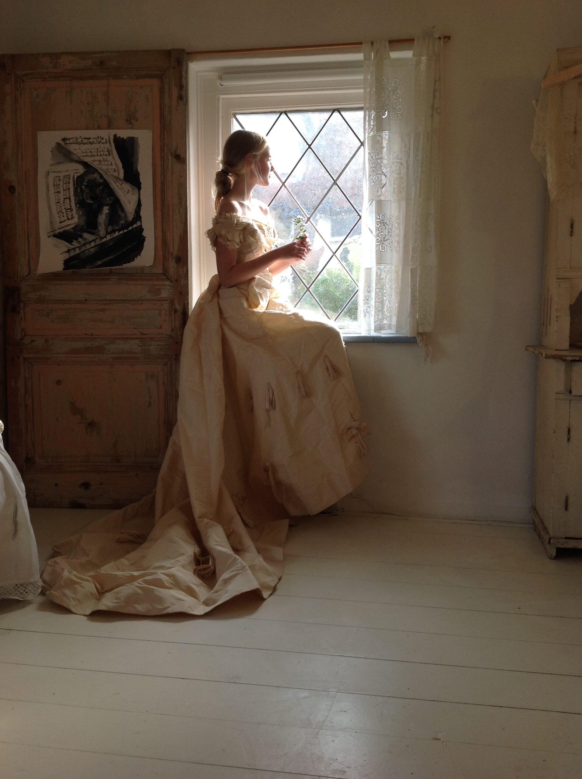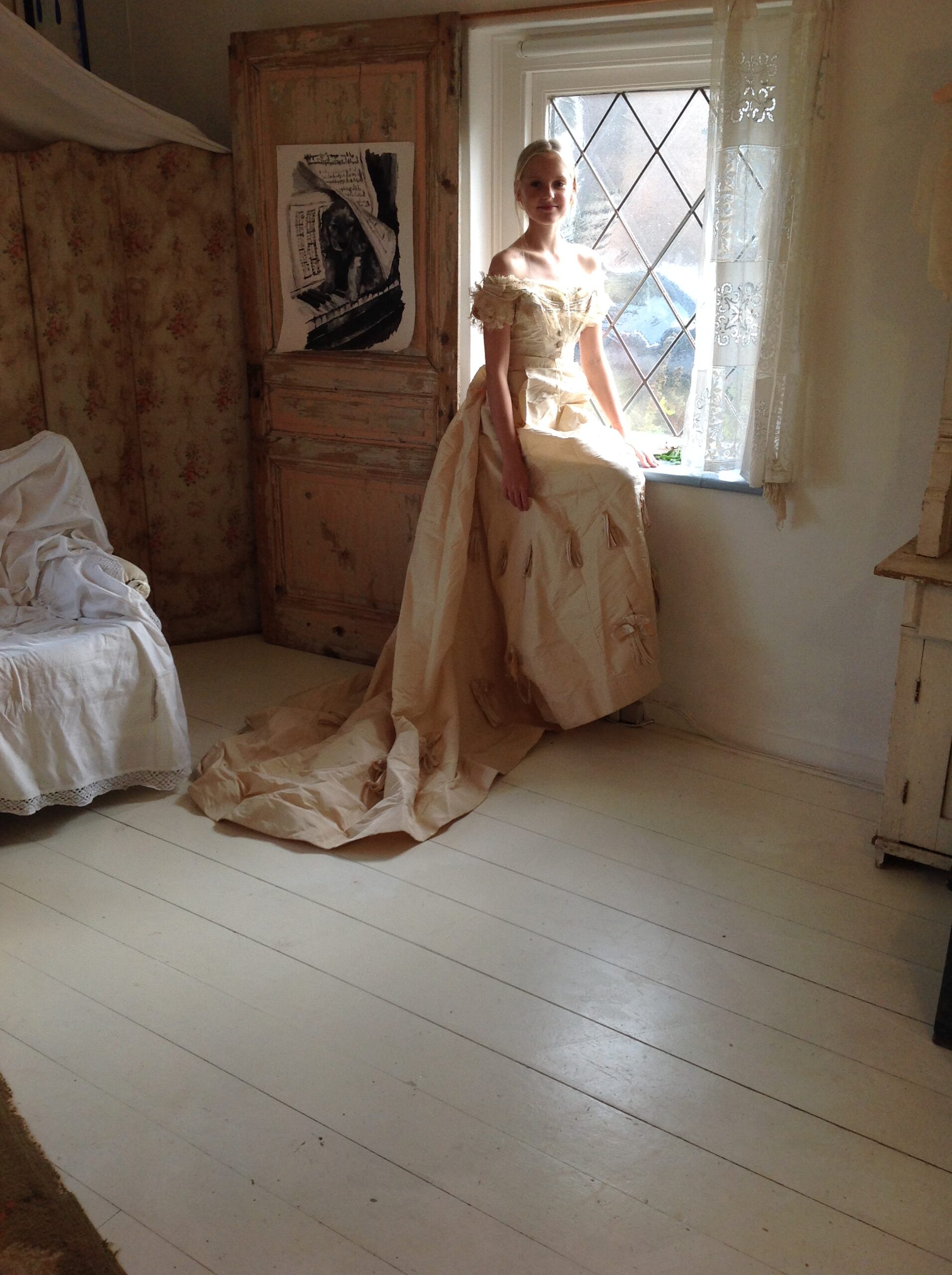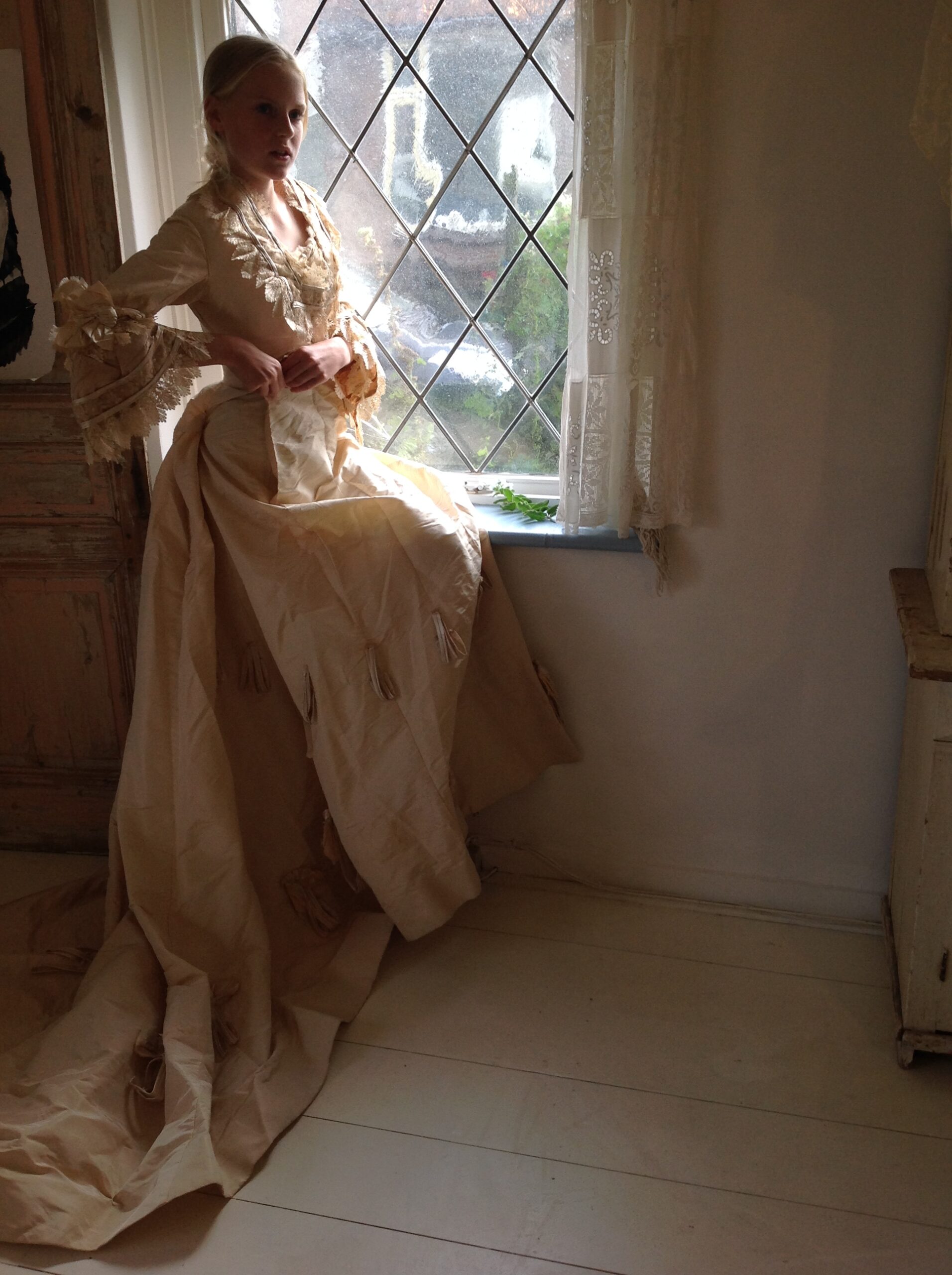 This product includes a silk bodice, a silk jacket and a huge silk skirt with a long train.