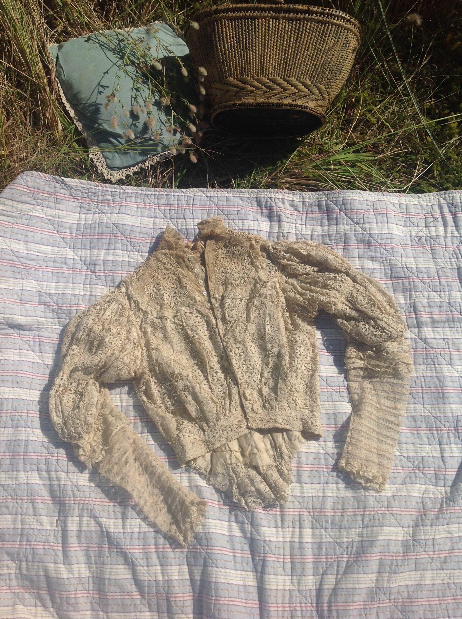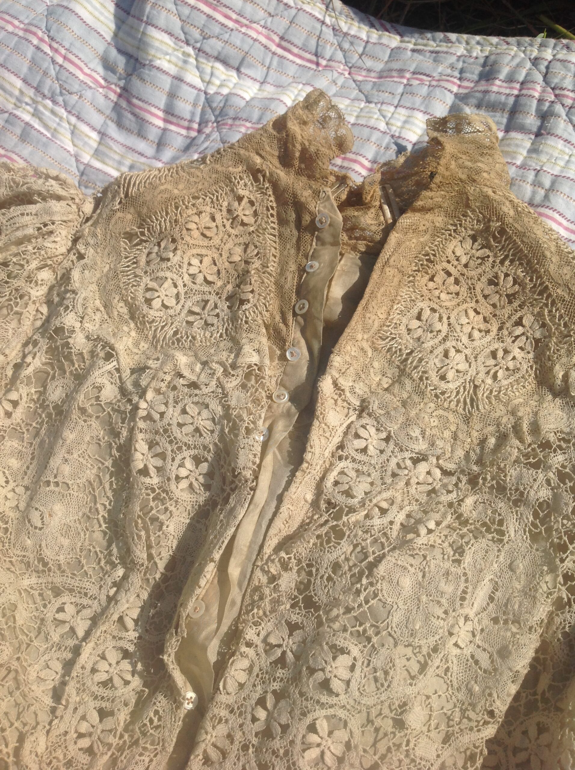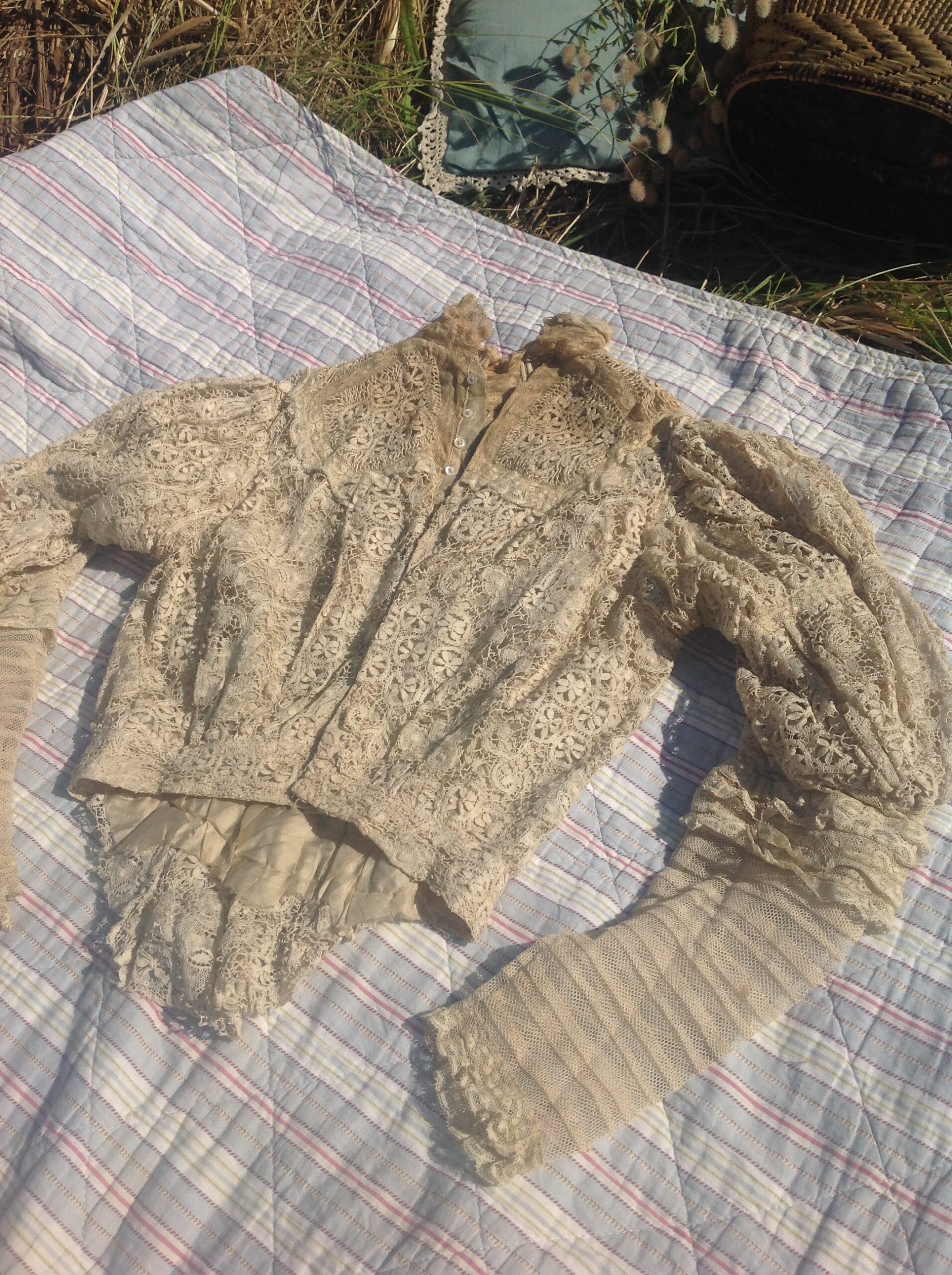An antique lace bodice, with silk lining and beige lace from the 1890s.