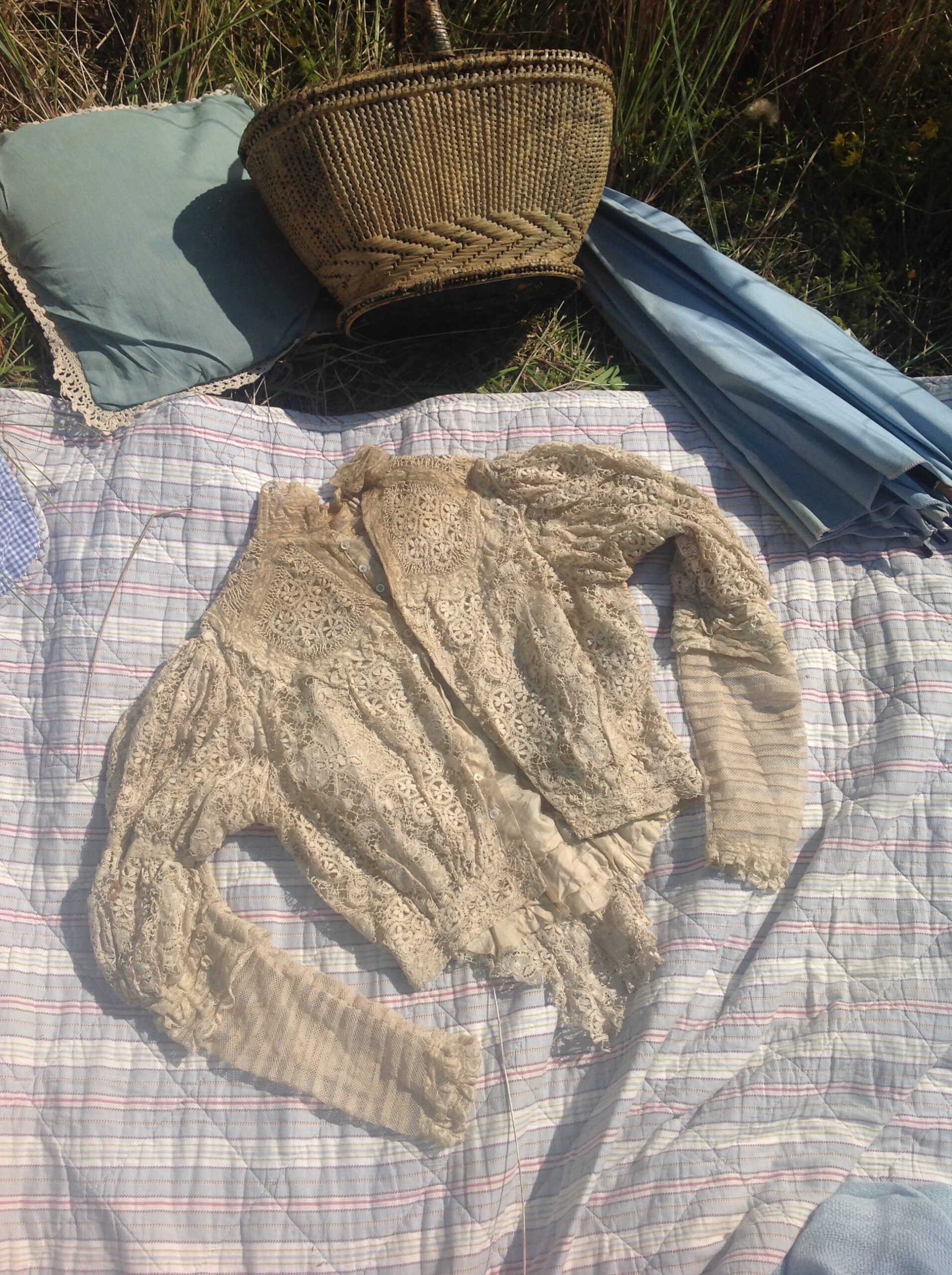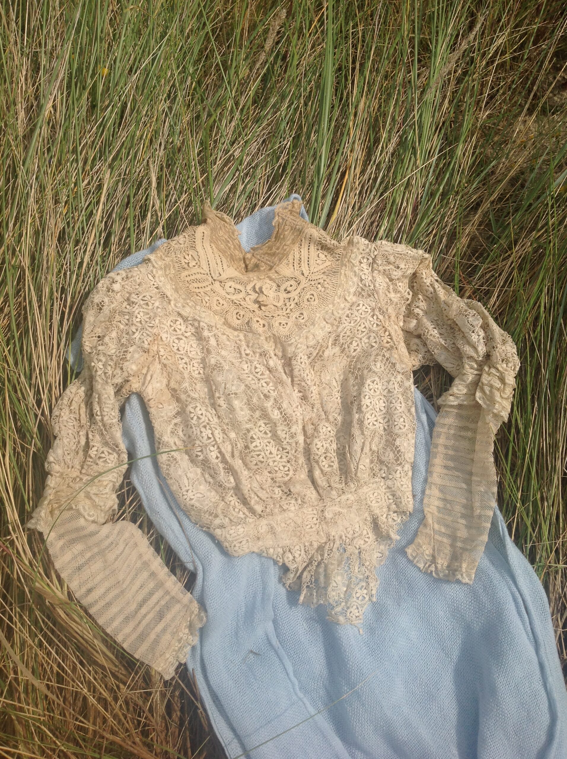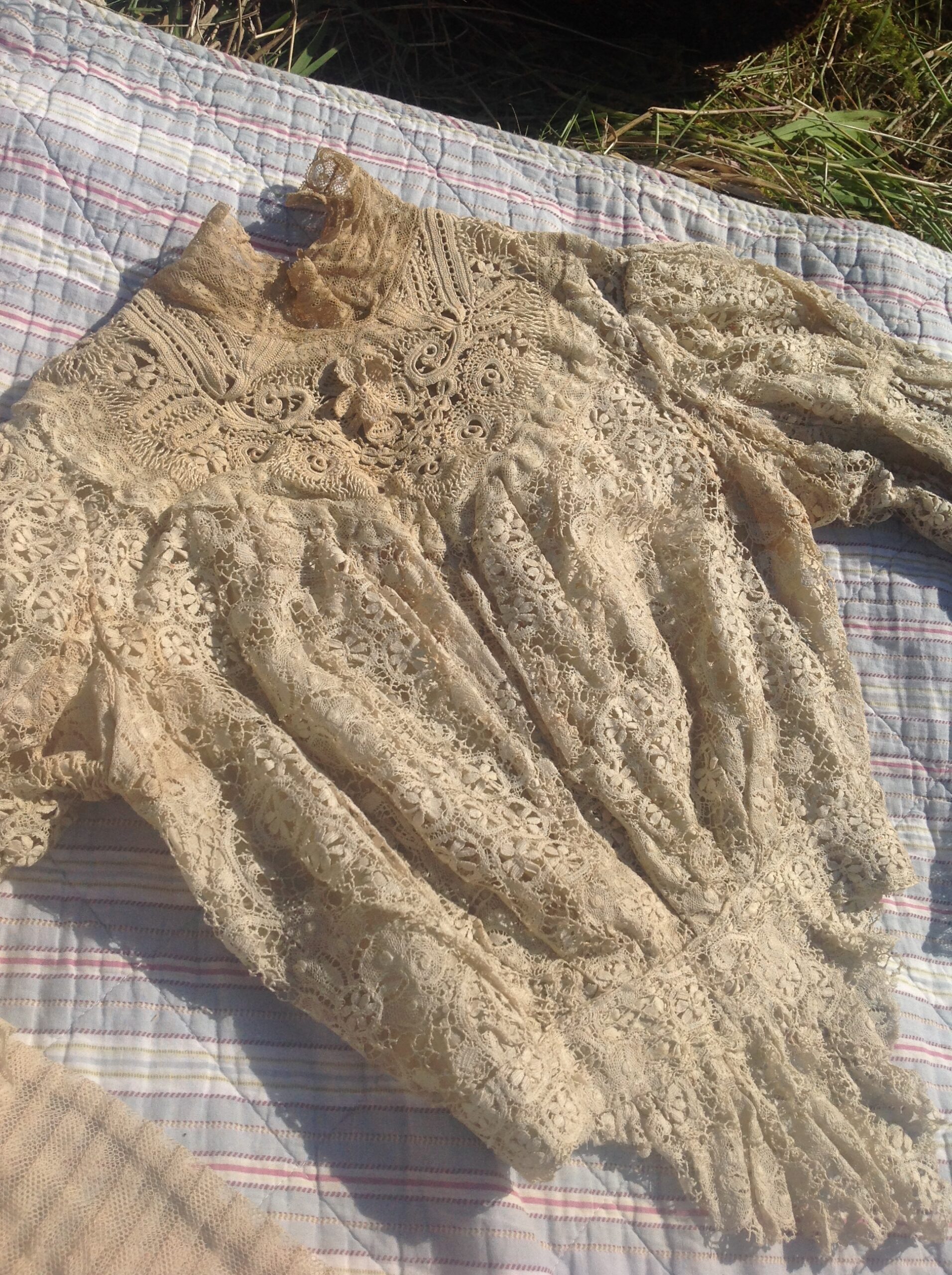 An antique lace bodice, with silk lining and beige lace from the 1890s.