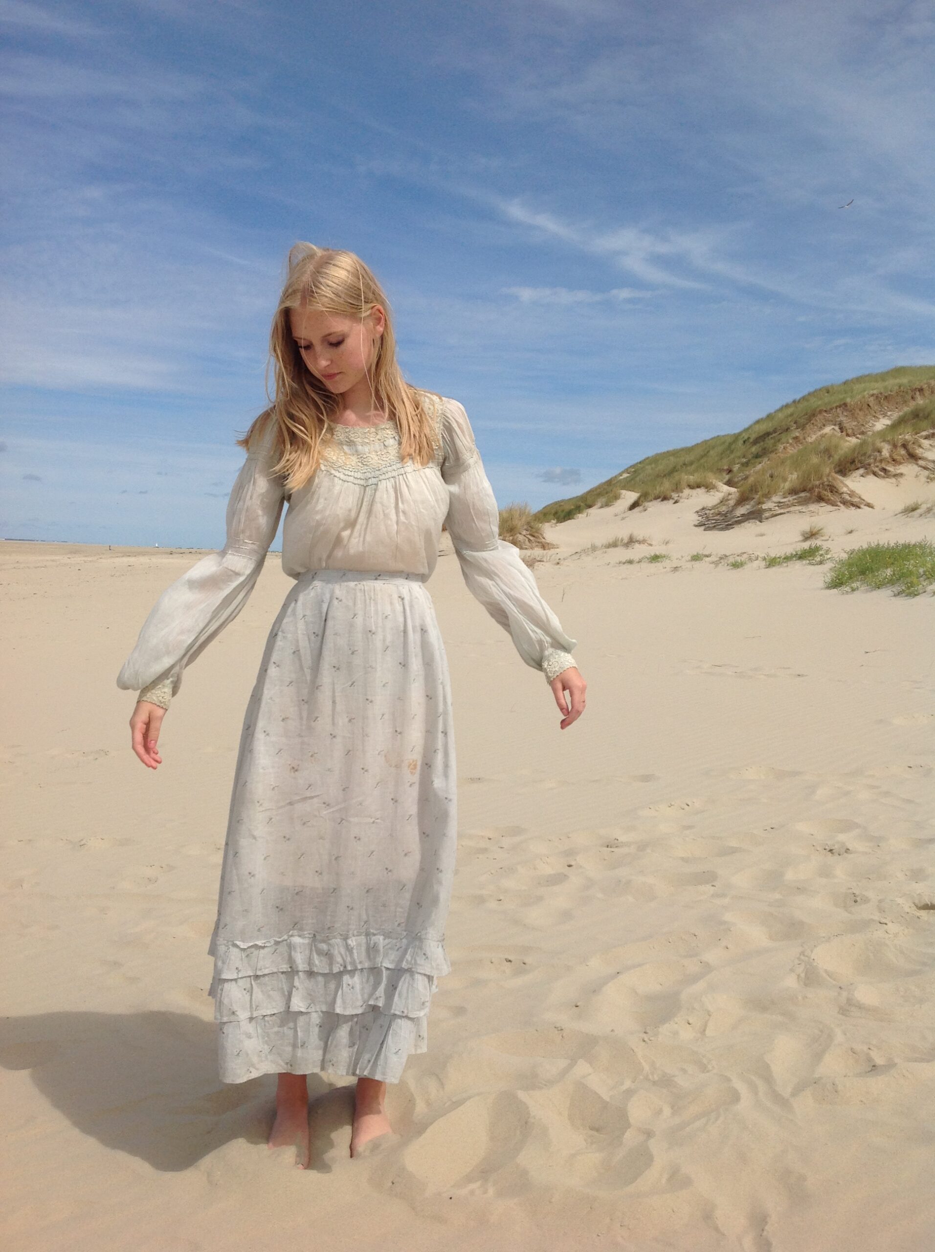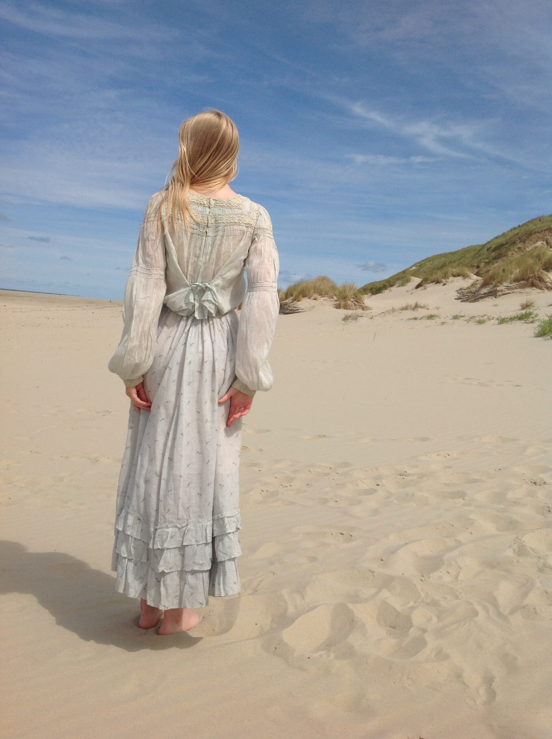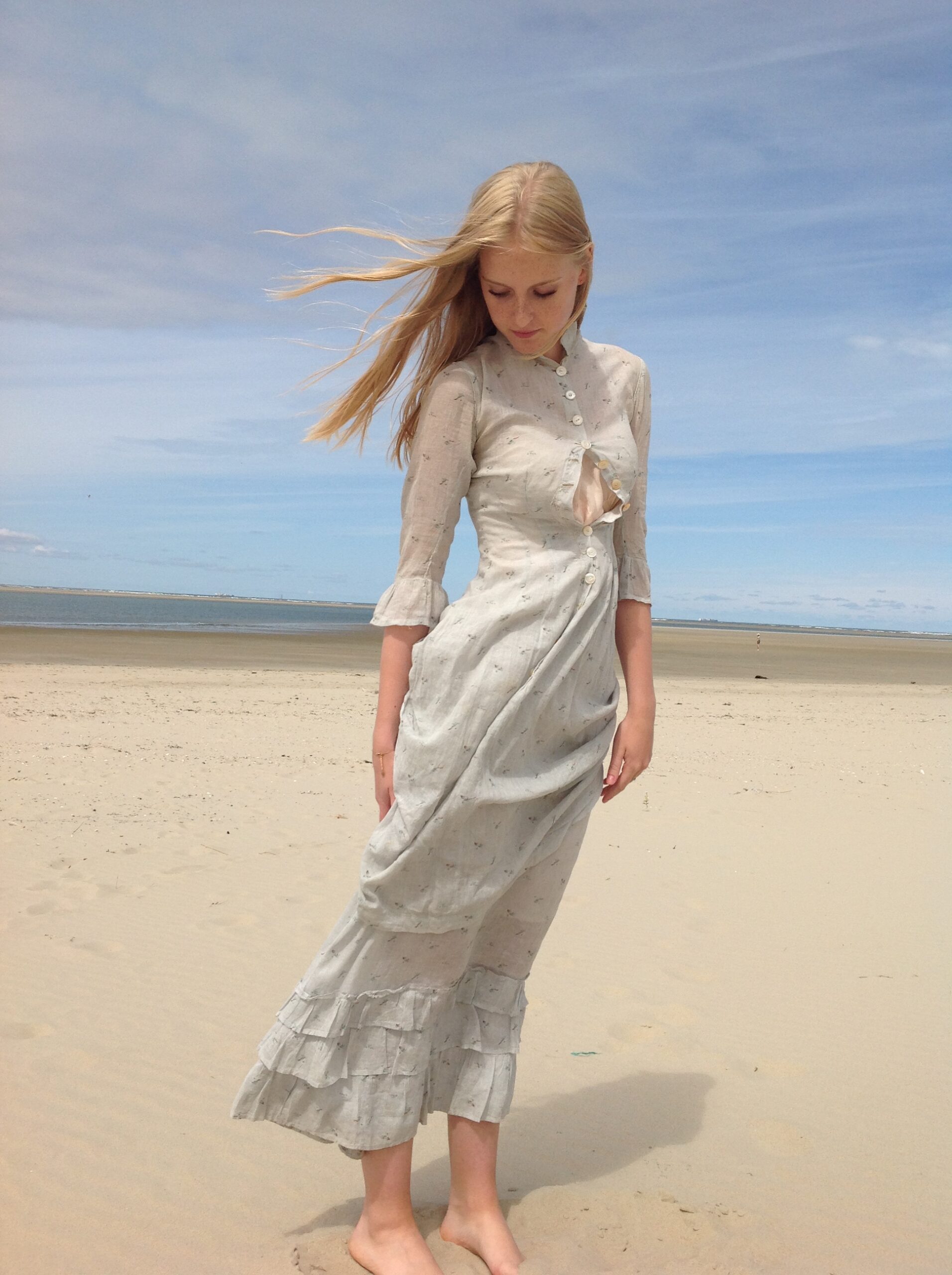 Lovely antique two piece dress consisting of a floral print skirt and a polonaise jacket. In the first 5 pictures my model is wearing a blouse with very long sleeves. This is not included in this listing.