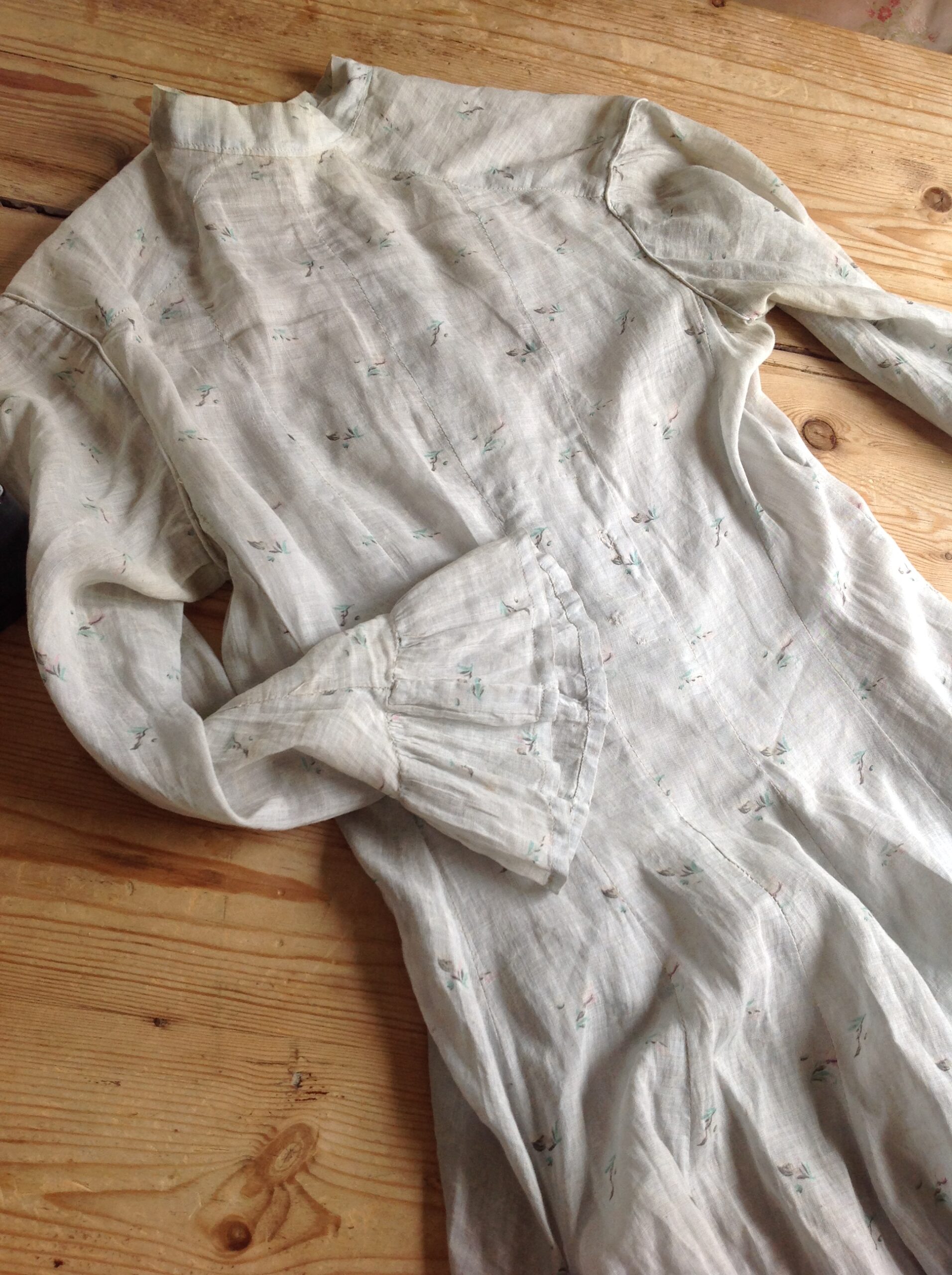 The color of the cotton dress is amazing, and the tiny floral print makes this dress so romantic..The jacket has a long bustle back shape. The skirt has a wider waist. At the front of the skirt is a stain. The dress is likely very old. It was worn by Melissa Atkinson, who passed in 1884.