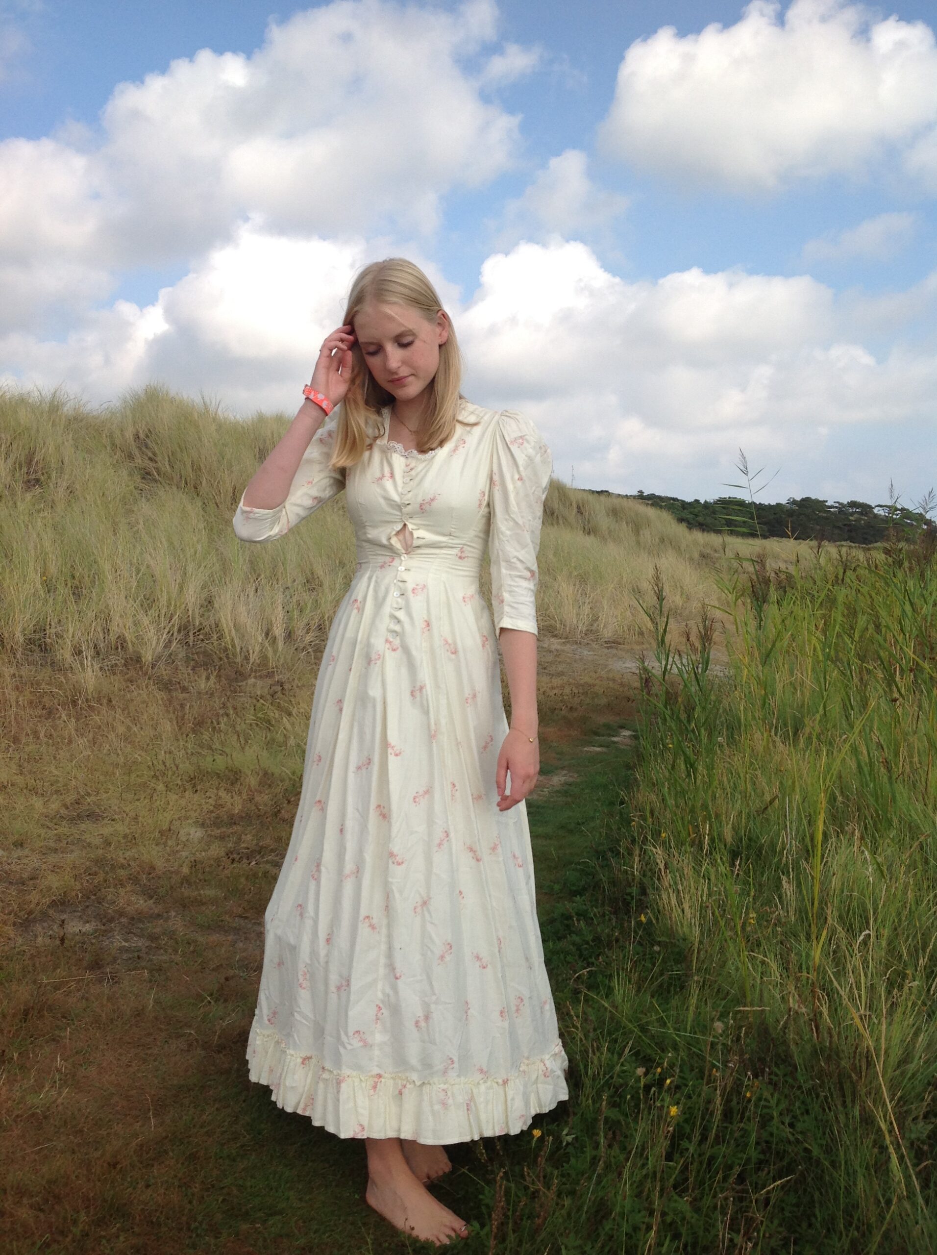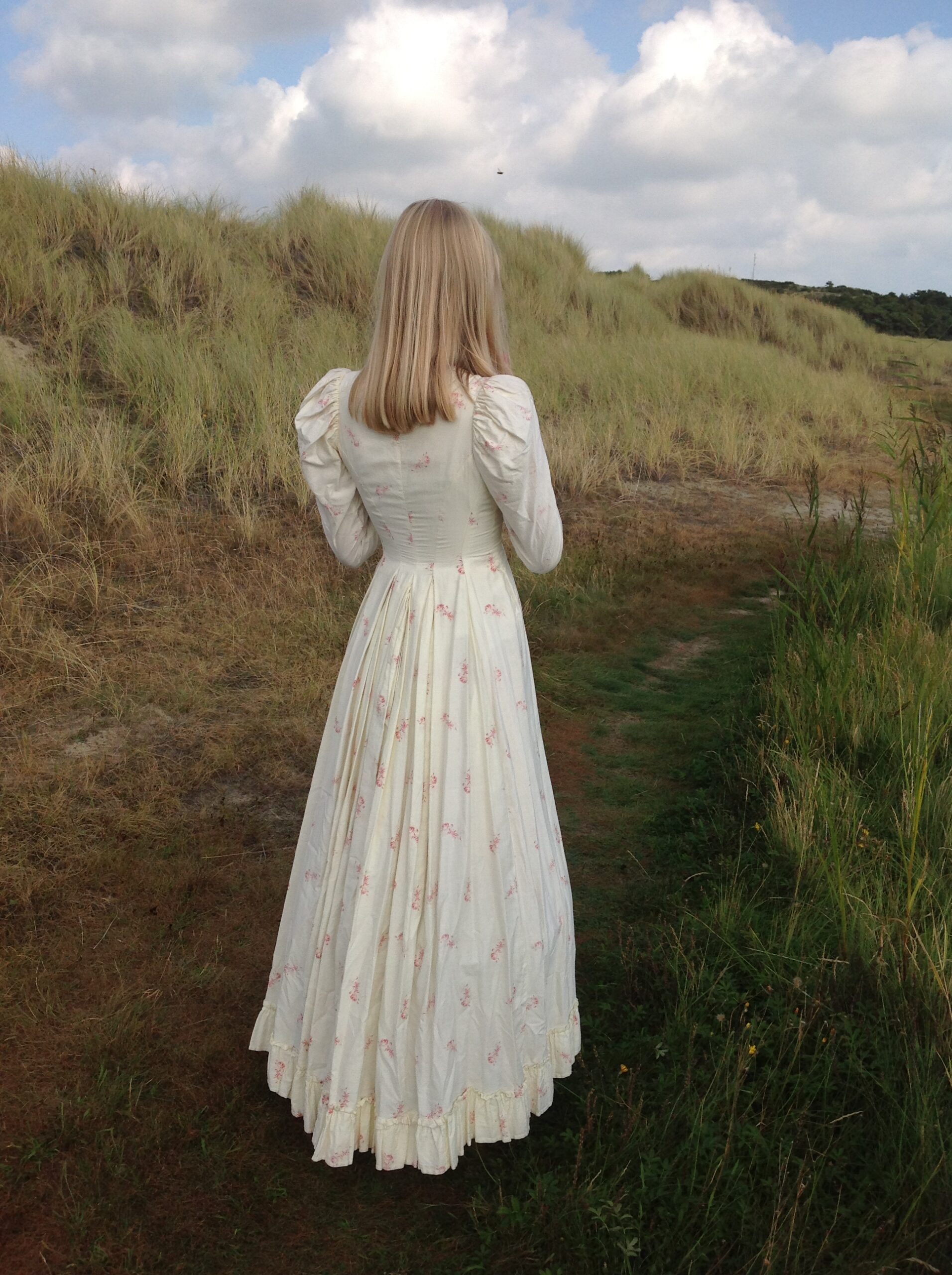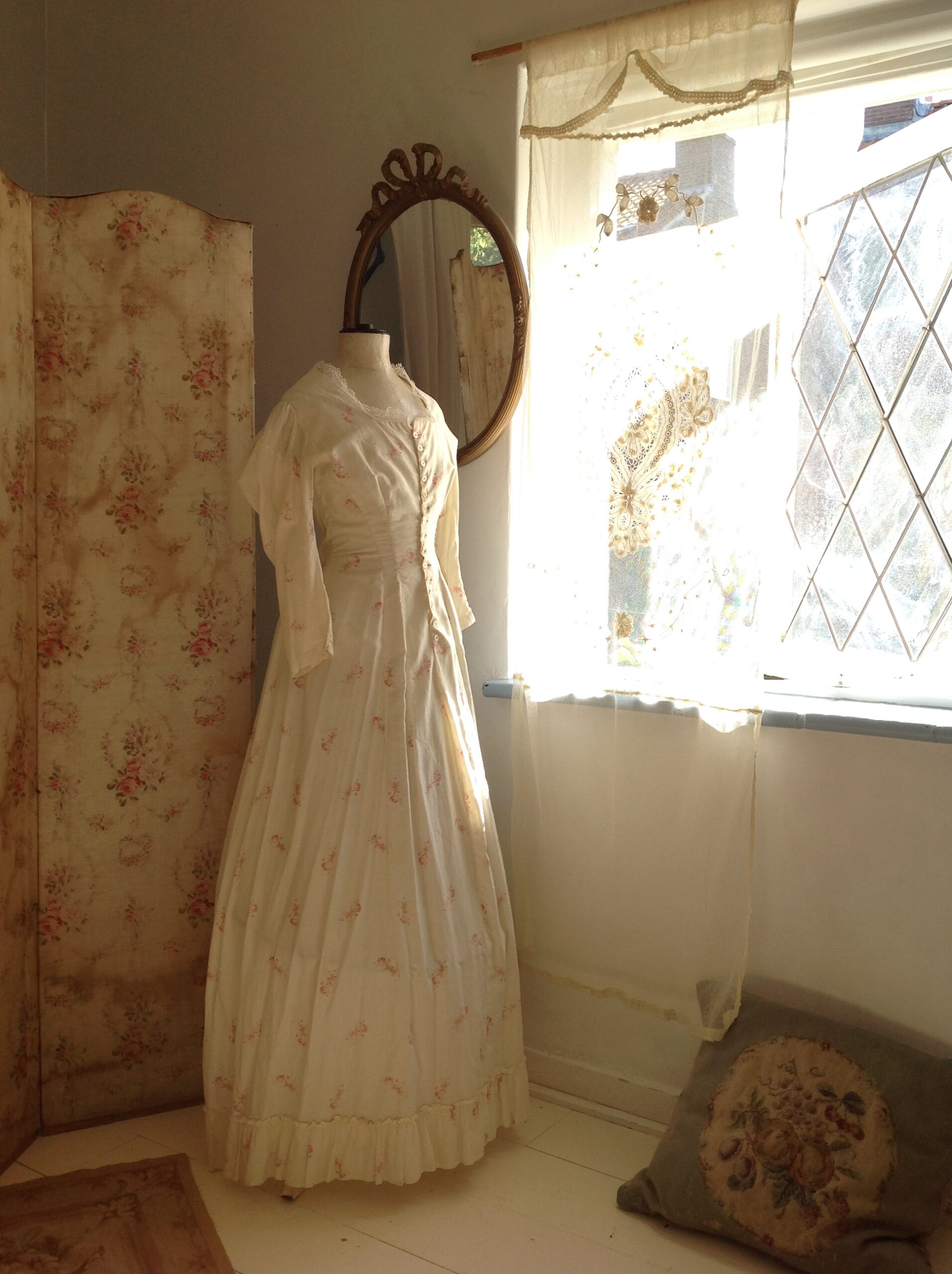 An antique dress with lovely roses print and strong fabric. The soft cotton has a cream white color. The top of the dress is fully lined with cotton and there is a bustle made at the back of the waist. The hemline has ruffles. Along the neck line you see free white lace, made of linen. It has beautiful buttons