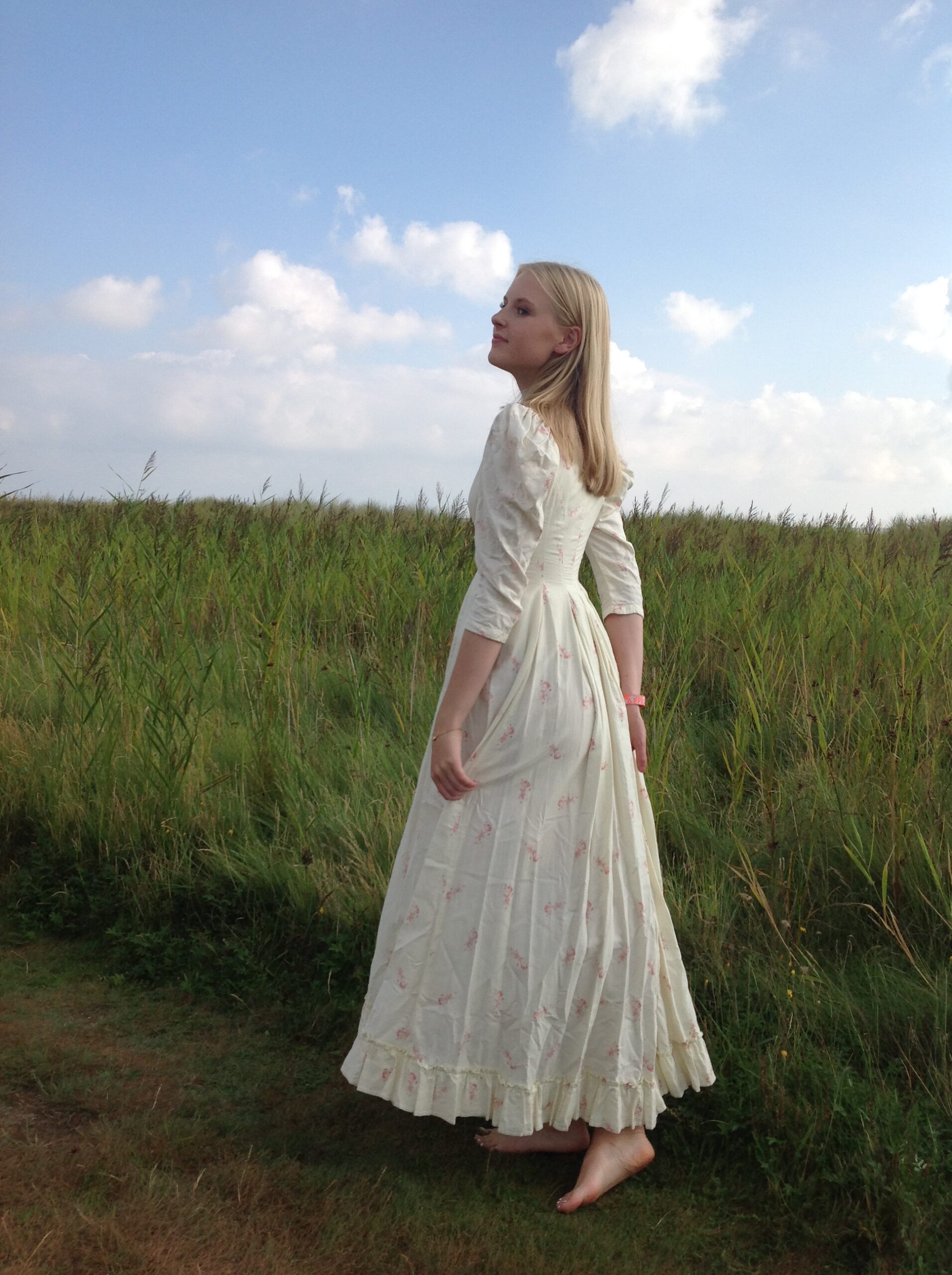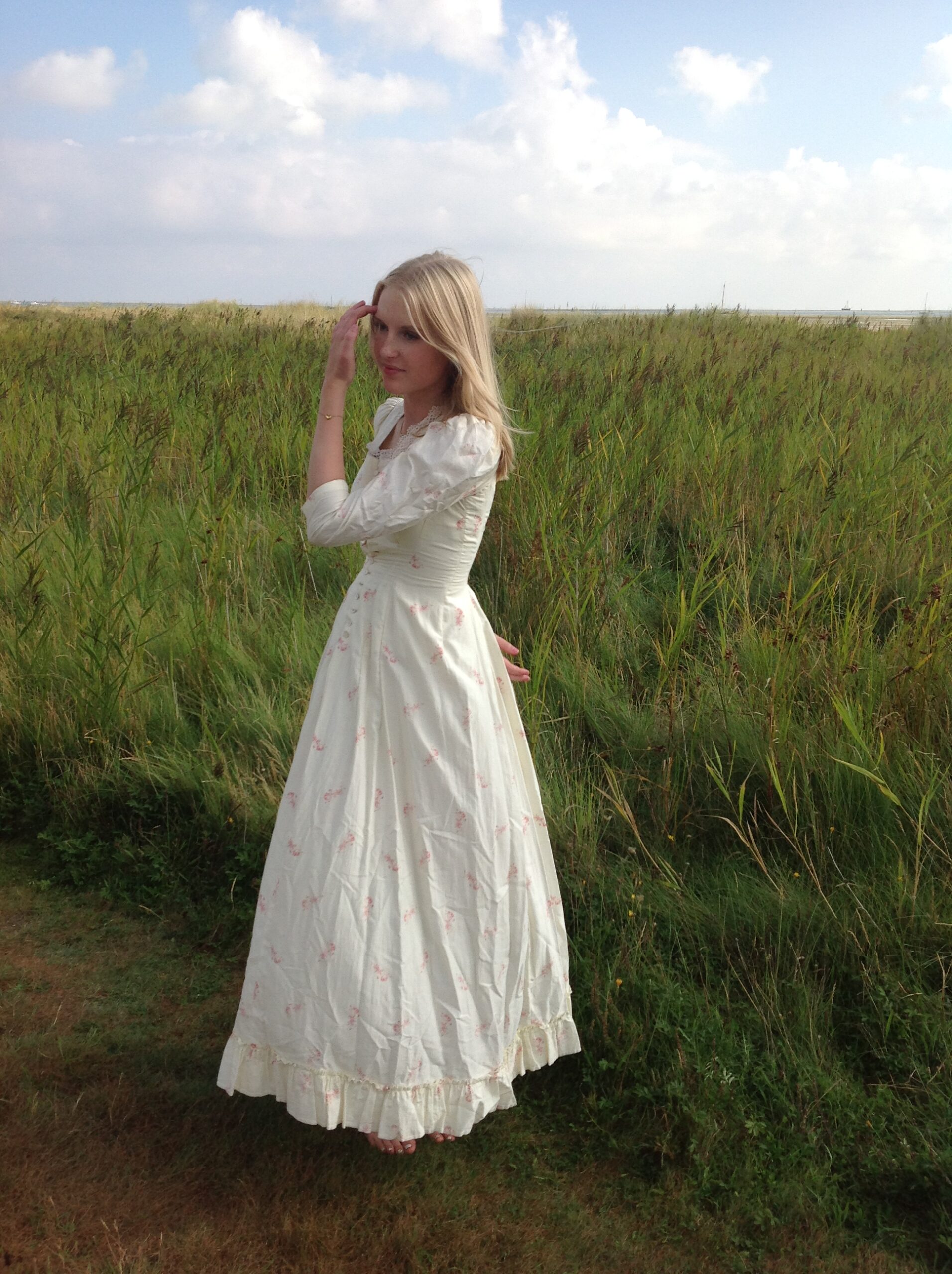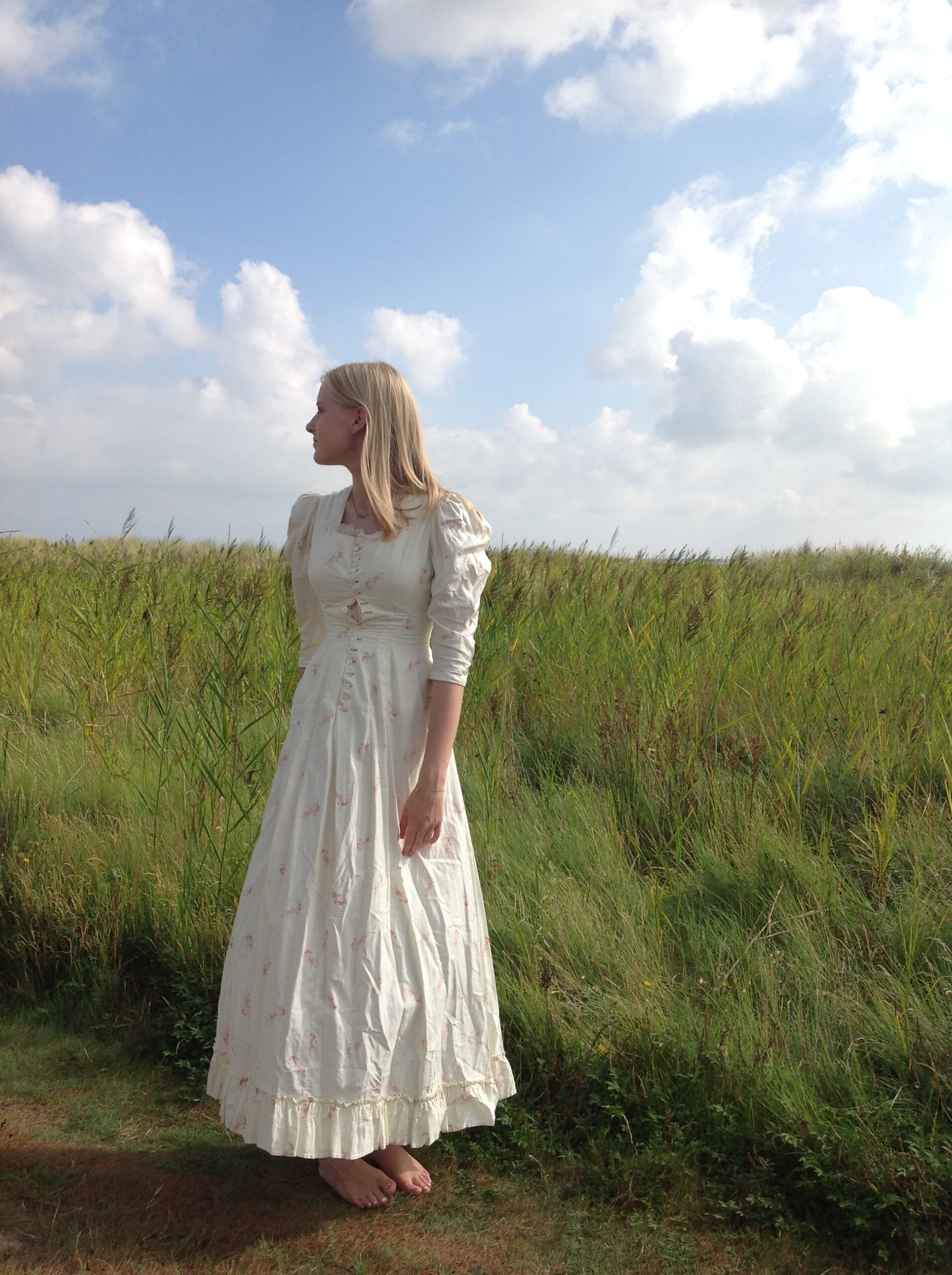 An antique dress with lovely roses print and strong fabric. The soft cotton has a cream white color. The top of the dress is fully lined with cotton and there is a bustle made at the back of the waist. The hemline has ruffles. Along the neck line you see free white lace, made of linen. It has beautiful buttons