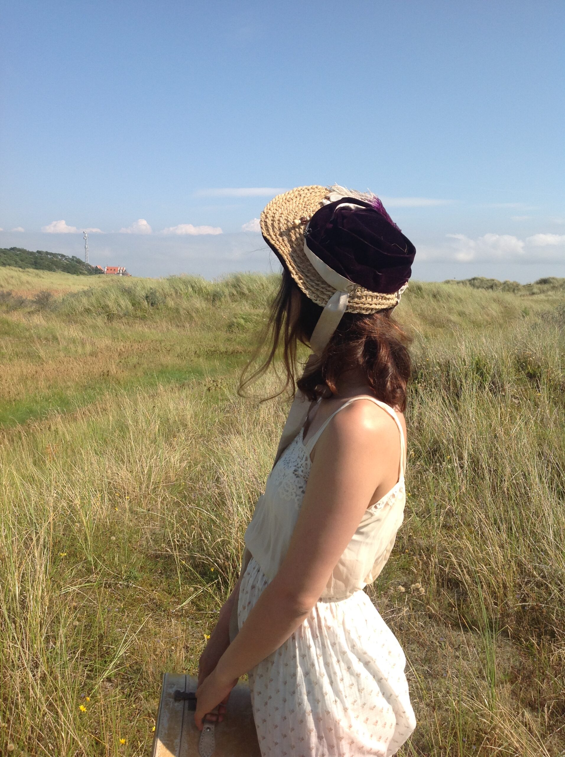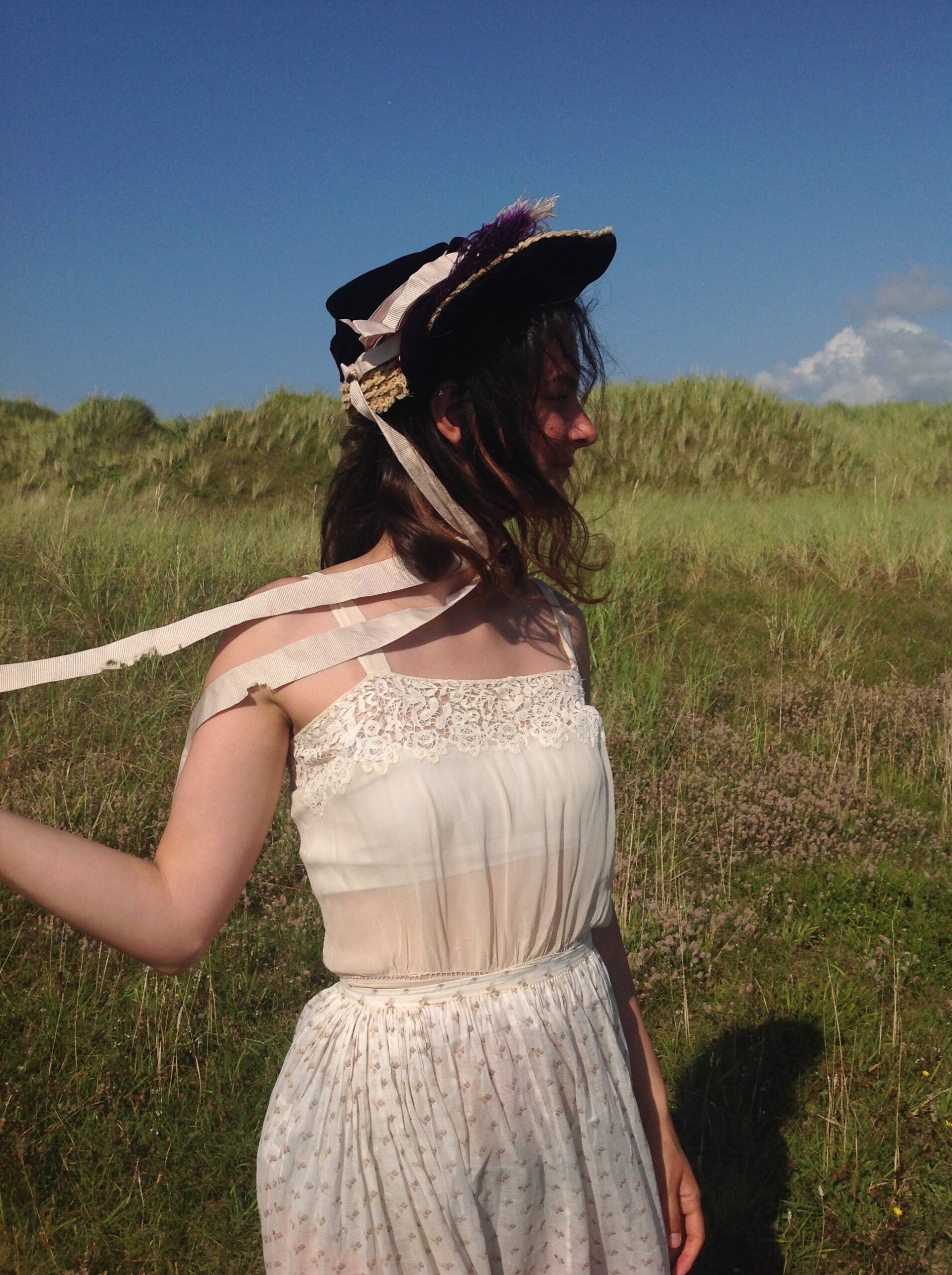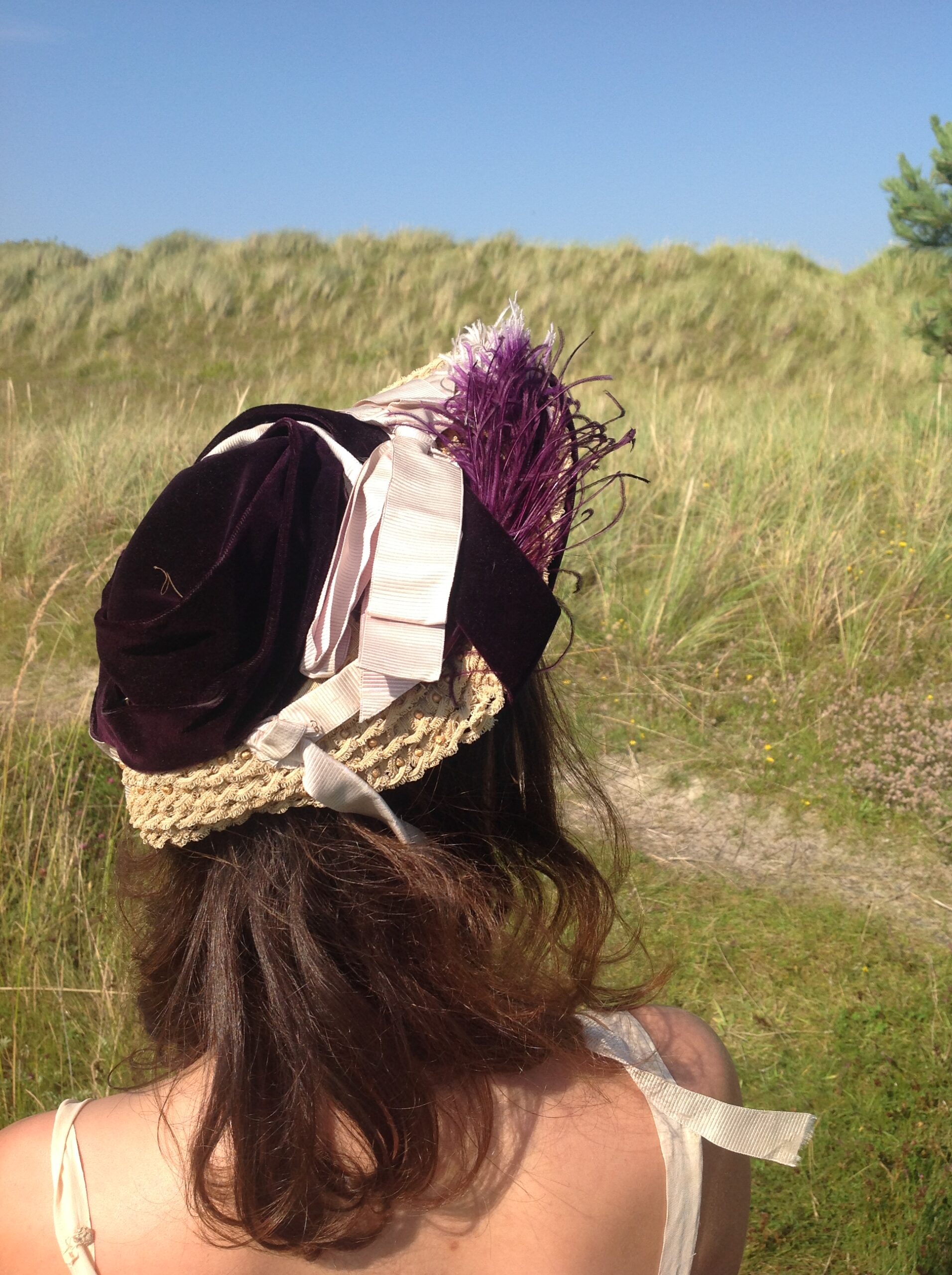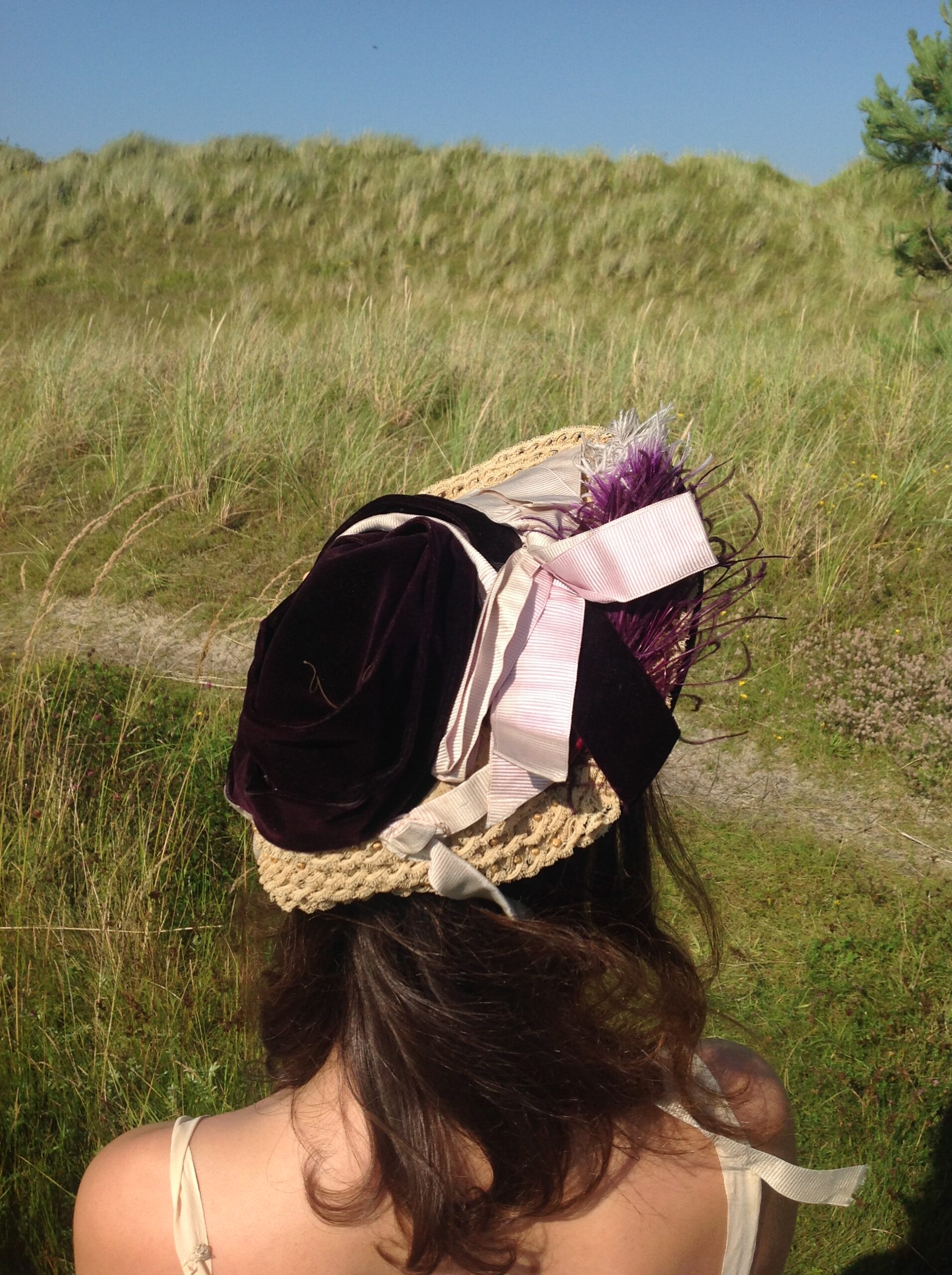 A beautiful silk velvet straw hat / bonnet in a aubergine color. The silk ribbons once had a lilac/ pink color, but their original colors are faded. (see the last 2 photos)