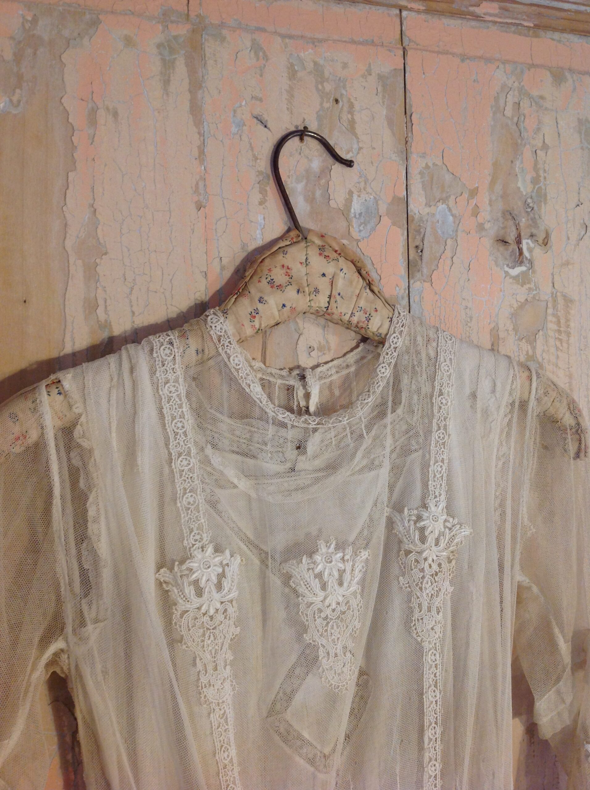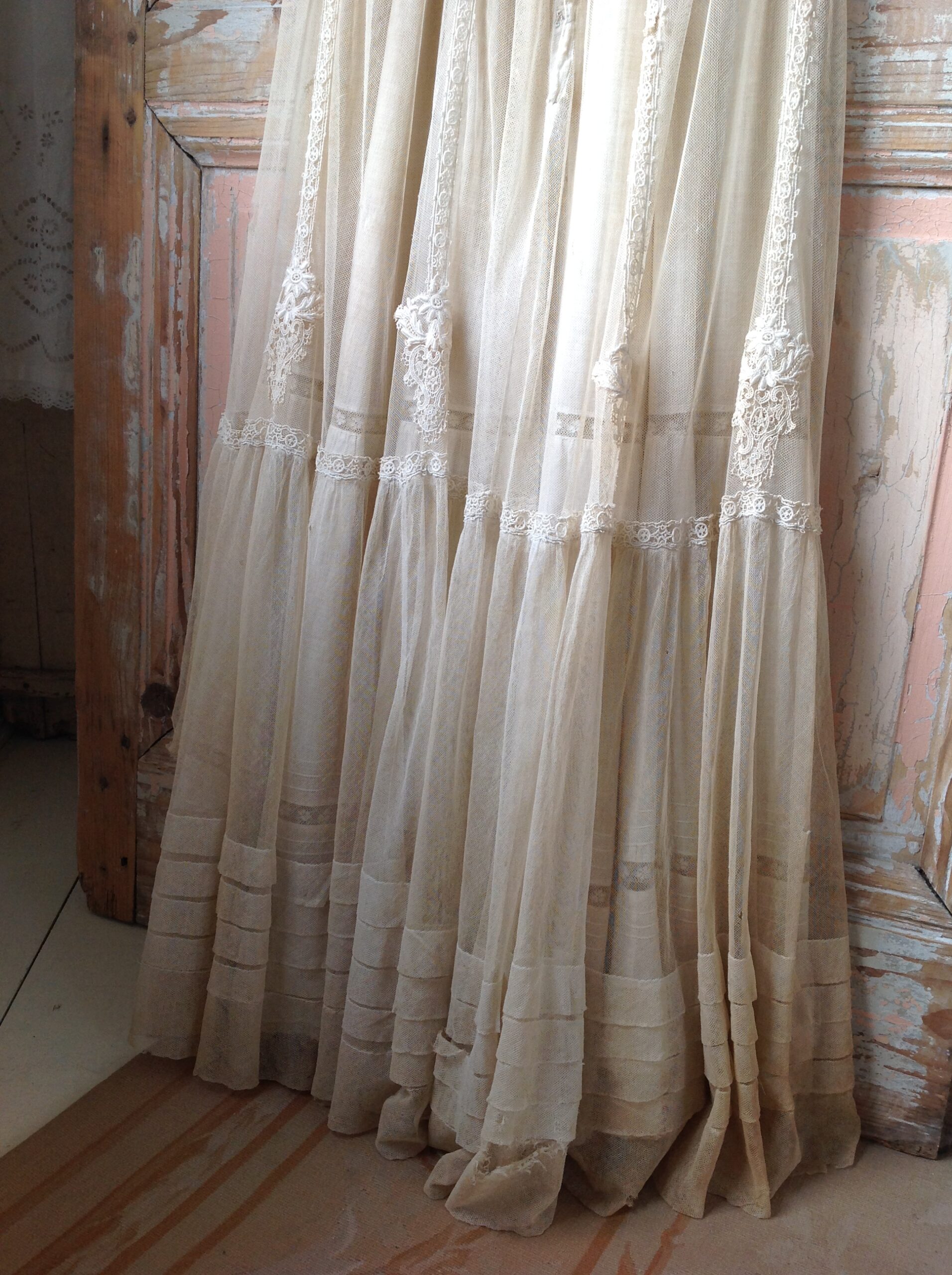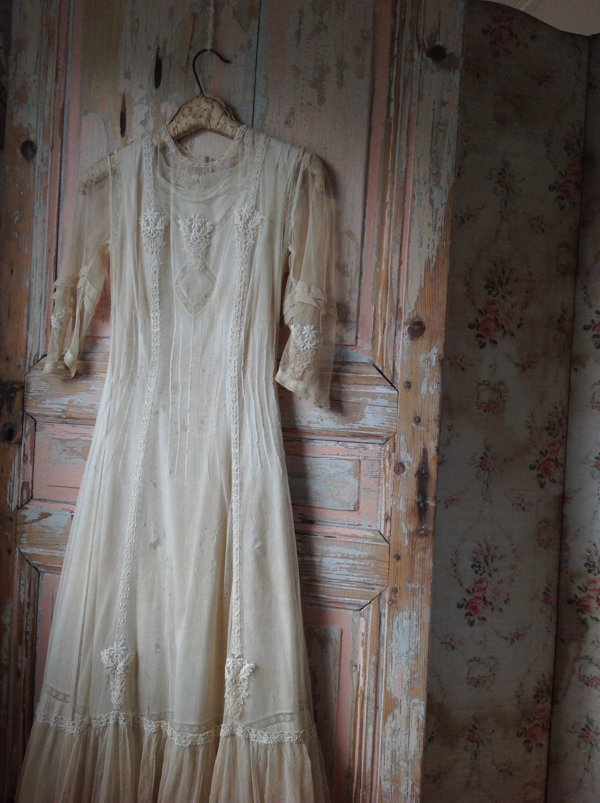 This is a wonderful net lace dress with floral applications and with a cotton lace slip dress. The tulle dress has a large tear at the bottom and the front area has several holes. That makes it only suited for study or display.