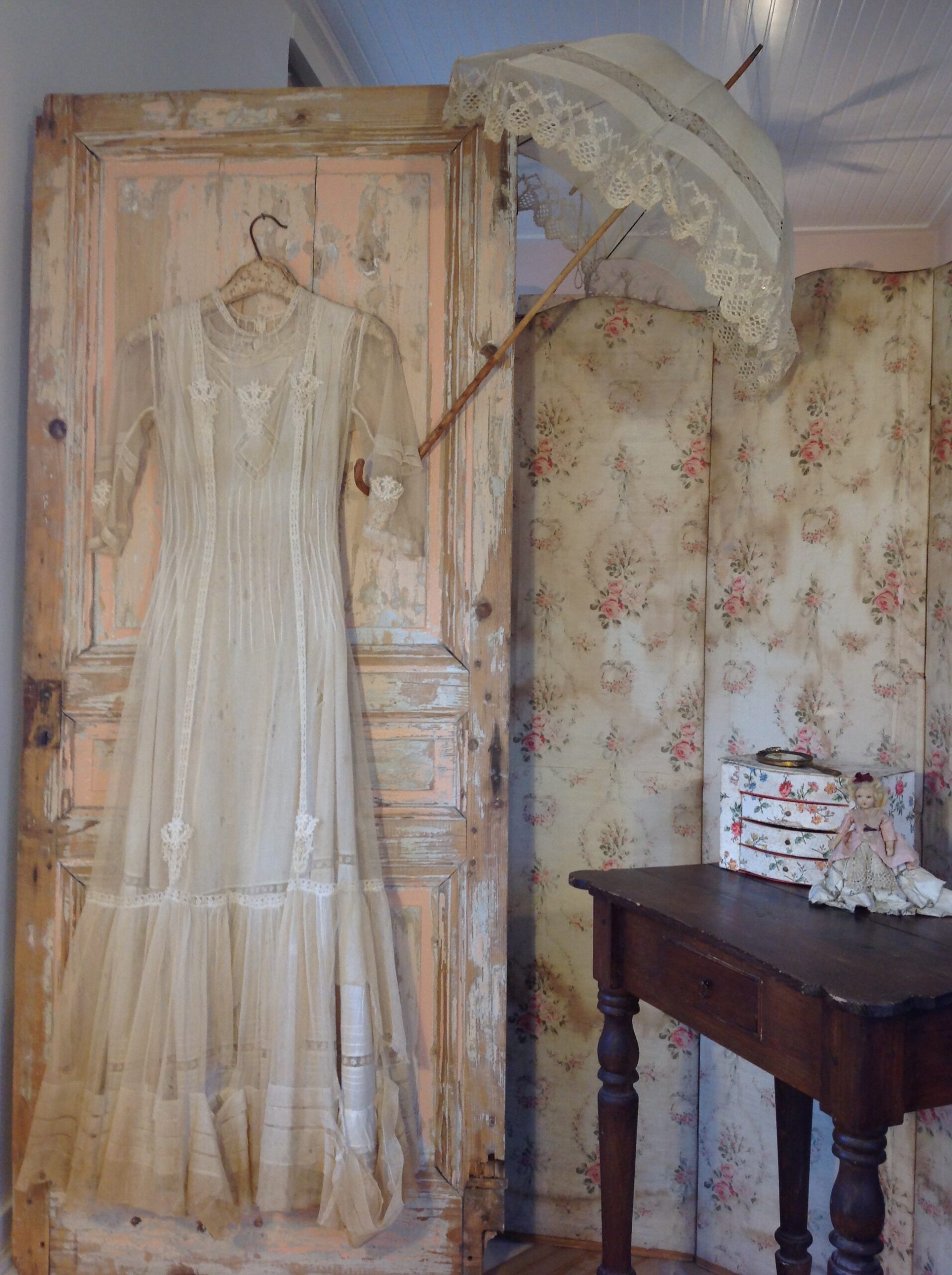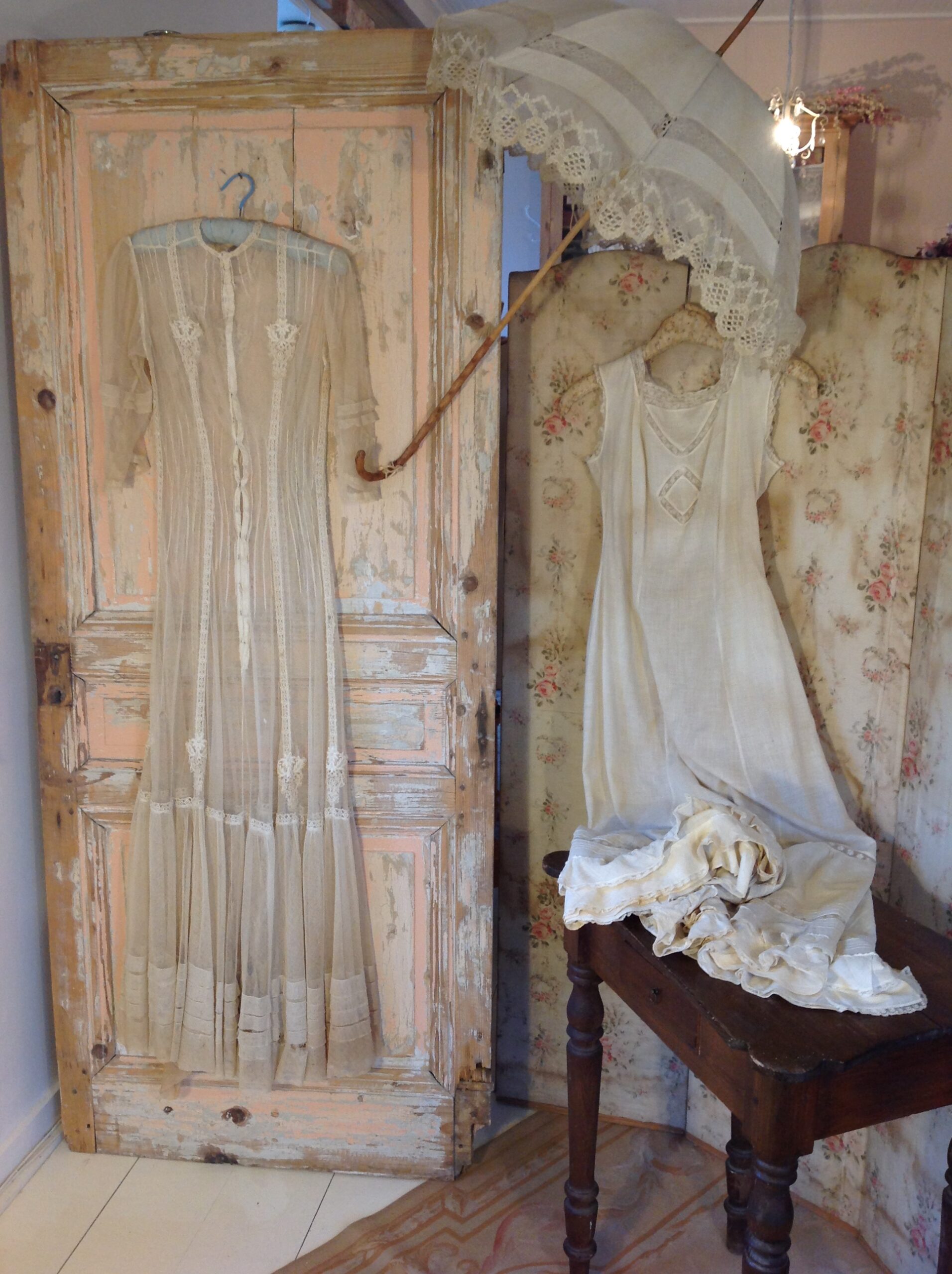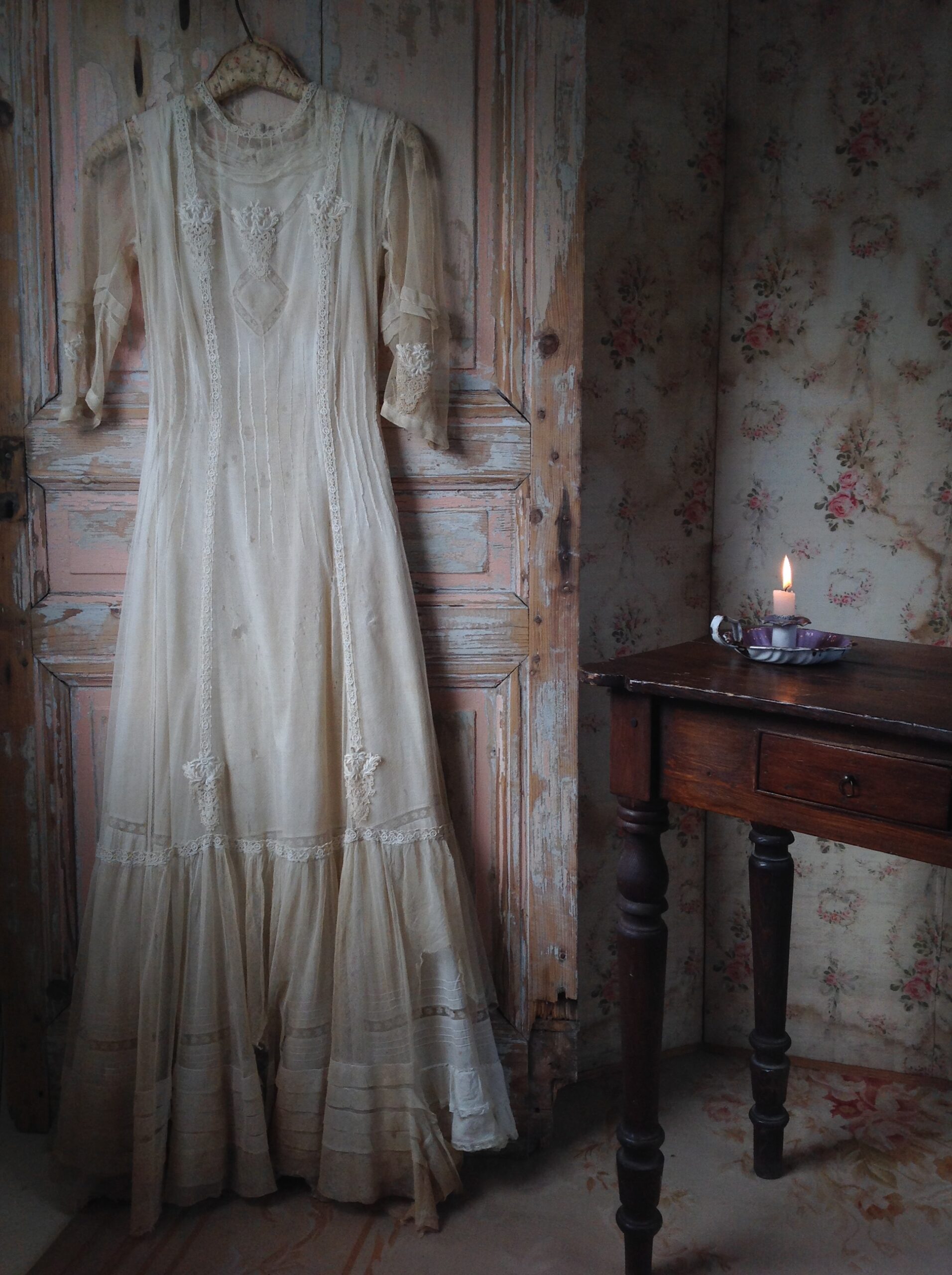 This is a wonderful net lace dress with floral applications and with a cotton lace slip dress. The tulle dress has a large tear at the bottom and the front area has several holes. That makes it only suited for study or display.